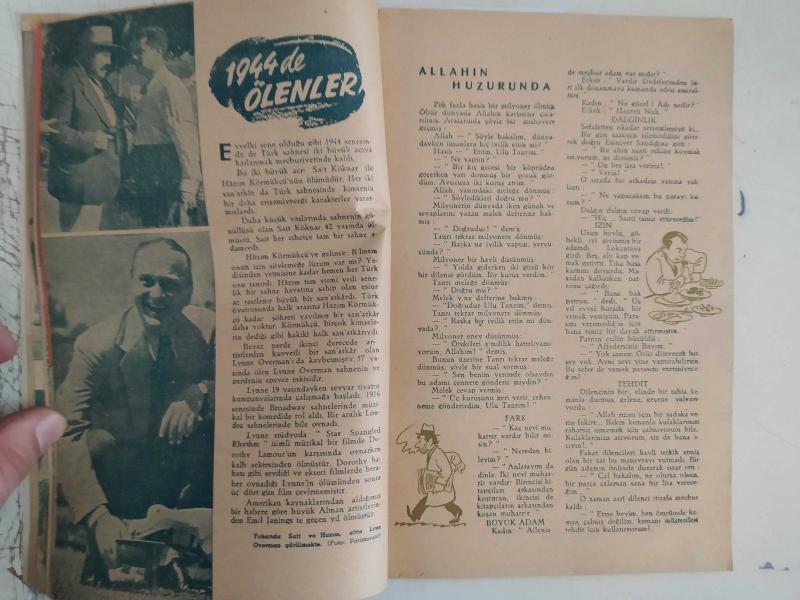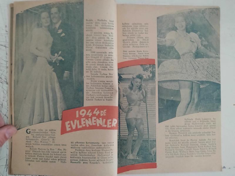 Yıldız Haftalık Aktüalite Sinema Tiyatro Müzik ve Magazin Dergisi - 1945 Yıllığı - 11 Aralık 1945 - Dünkü ve Bugünkü Hollywood - 1944'da Ölenler, Boşananlar, Sevişenler, Ölenler - Bahar - Aktüalite - Lilli Marlene - Shirley nasıl büyüdü? - Frank Sinatra - Beyaz Perde Kraliçeleri - Taylor'un Ninesi - 1944 de Filmciliğimiz Rakım Çalapala - Robert Young - 1944 de Neler gördük? - 1945 de neler göreceğiz? - En Genç - En İhtiyar - Roy Rogers - Banyo Tavsiyeleri - Perdenin Anne ve Babaları - Dinah Shore - Hollywood'da Mülteciler - Yaz - En Son Modaları - Beyaz Perdede Cazcılar - Yeni Çiftler - Boyanacak Resimler - Hollywood Aileleri - Tarihi Daniel - Sonbahar - Hollywood Kantini - Güzel Saçlar - Kim kimi taklit ediyor? - Kış - Hedy'de Ne Var? - Marlene Dietrich - Hikaye ve Roman - Şeytan Tüyü - Bir Genç Kız Ne Zamana kadar haya lkurabilir? - Çingene güzeli - Metindeki tablolar - Myrna Loy - Linda Darnell - Alan Ladd - Margerite Chapman - Rezan Özkonuk - Cezmi Tarık - Tam Takım Dergi Yıpranma, sararmalar, kupon kesiği ve yırtılmalar zamana bağlı olarak görülebilir