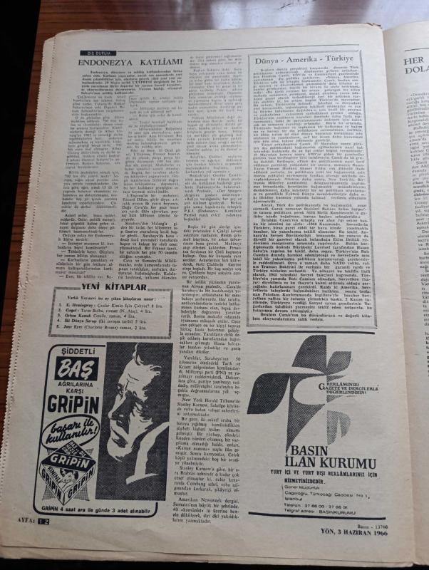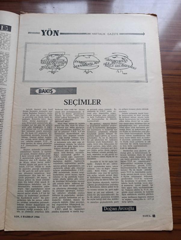 Yön Gazetesi - Turkish Newspaper - 3 Haziran 1966 - İsveç sosyalist mi - seçimler yazan Doğan Avcıoğlu - seçim kampanyasının baş Yıldızı Osman Bölükbaşı Fotoğrafı - İstanbul ve Ankara yazan İlhan Selçuk - Şadi Alkılıç'ın yargıtaya cevabı - Robert F. Kennedy'nin sözleri - Kurtuluş savaşı belgeleri yazan Erol Ulubelen - halkevlerinde ne oluyor - Second Class Property yazan Mehmet Kemal - Arap dünyası uyanıyor mu yazan Niyazi Berkes - Endonezya katliamı - varlık yayınevi bu ay çıkan kitaplarını sunar - bu düzenin asıl adı yazan Fakir Baykurt - devlet tiyatrosundaki oyunlar yazan Engin Ünsal - Ercüment Behzad Lav'ın May Vong Vietnam destanı şiiri - Kore mucizesi yazan Joan Robinson - köyler elektriğe kavuştu - neden Atatürk'ü sevmiyorlar - odalar Birliği Genel Kurulu - Sadun Tanju'nun beraati - İsveç kadınları eşitlik hatta aşık edinme hakkı istiyorlar Fotoğrafı - sosyal devletin anahtarı vergi - Kadiri Ticani tarikatları kavgası - Cezayirli köylüler bir gösteride Fotoğrafı adlı eser, Kitap > Süreli Yayınlar > Gazeteler > Türkiye > Genel > Günlük kategorisinde İkinci El olarak satıştadır.