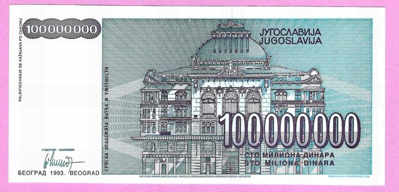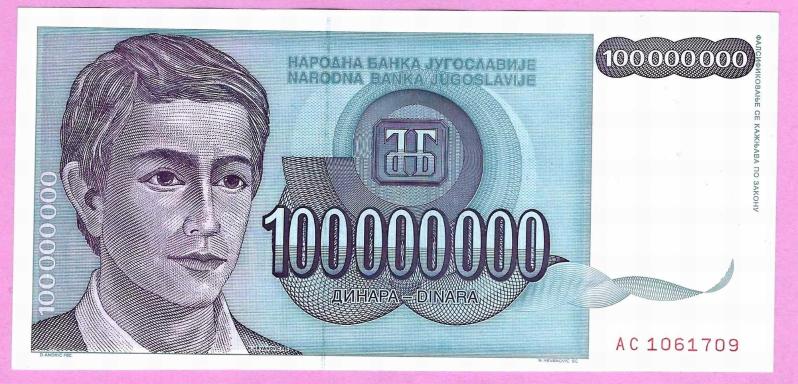 Yugoslavia 100000000 100.000.000 Dinara 1993 UNC (TK 17 072) ÇİL, dün satışa sunulmuştur.