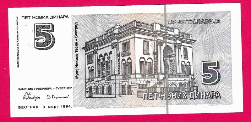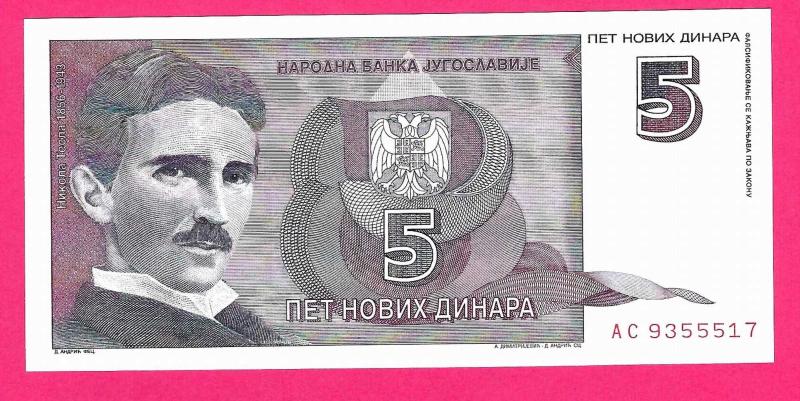 Yugoslavia, 5 Novih Dinara, 1994, P-148, UNC ÇİL, bir ay önce satışa sunulmuştur.