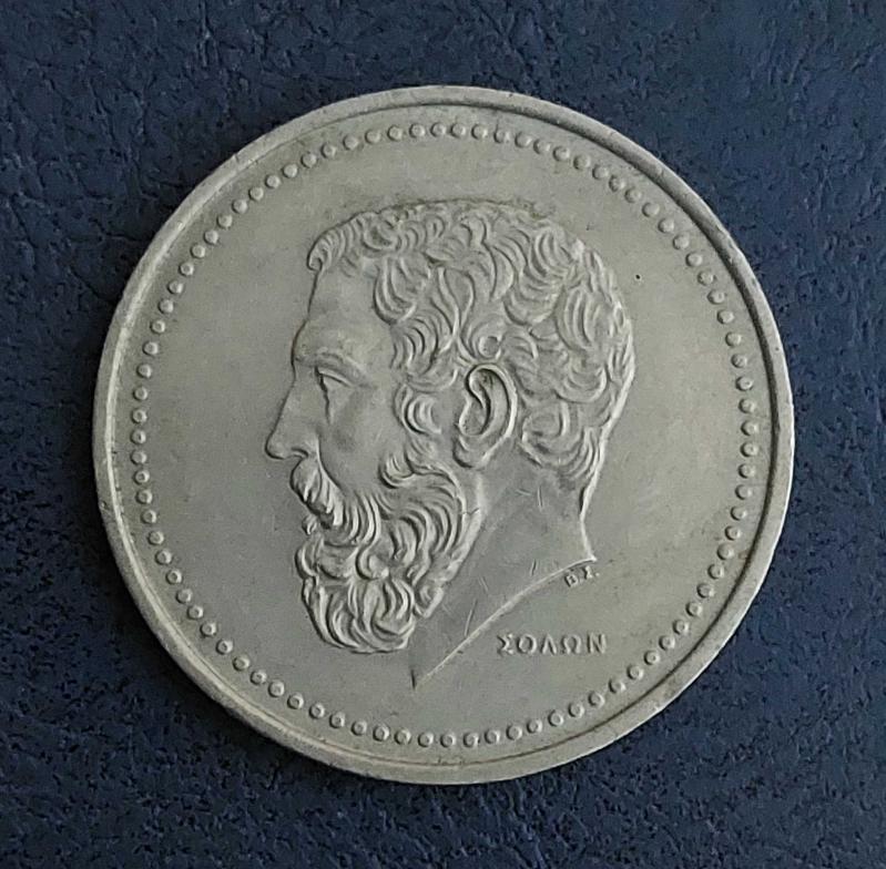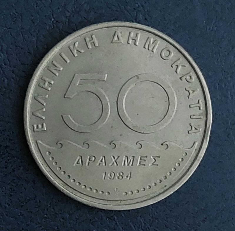 Yunanistan, 50 Drahmi 1984 Apaxmae. Ön Yüz; Deniz ve Dalgalar. Arka Yüz; Yunan Efsanesi: Devlet Adamı ve Şair Solon'un Sola Bakan Portresi. Bakır-Nikel. (ÇT)