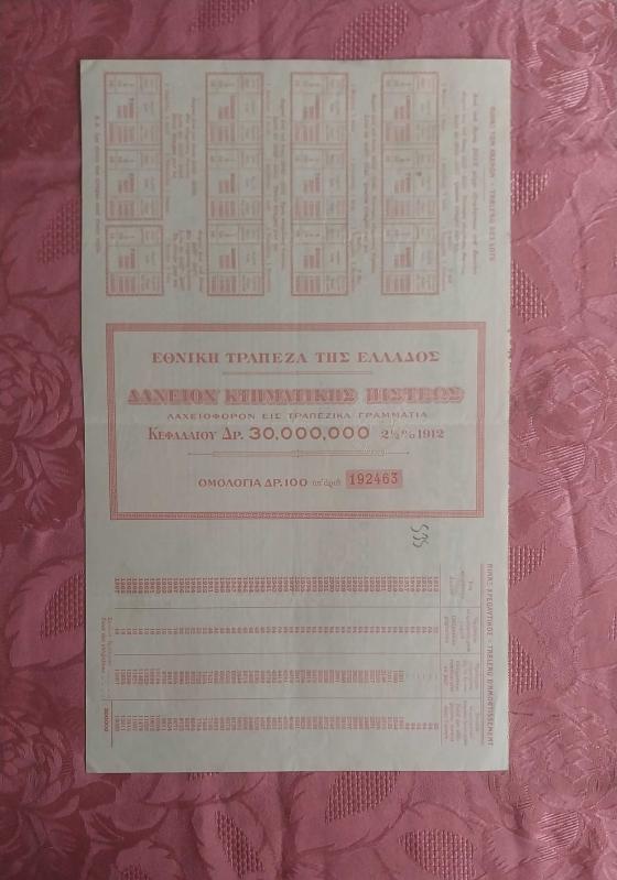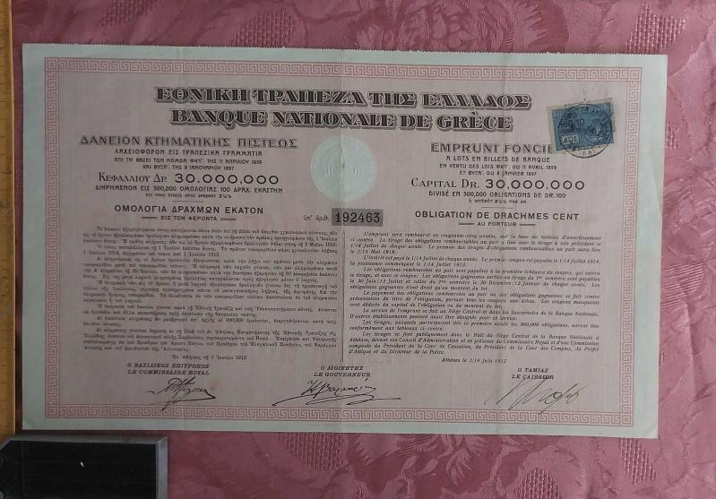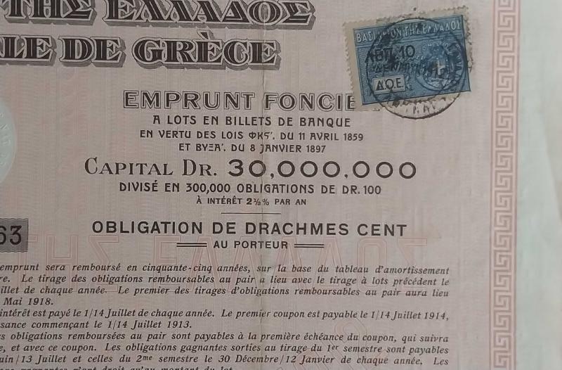 Yunanistan Millî Bankası Tahvili – 1912, 100 Drahmi Yunanistan Millî Bankası tarafından 1912’de çıkarılmış, 100 Drahmi nominal değerli emlak teminatlı tahvil (Obligation Foncier). Yunanca ve Fransızca iki dilli, filigranlı orijinal belge. Üzerinde dönemin “Krallık” damgası (10 Drahmi vergi pulu) bulunmaktadır. Arka yüzünde eksiksiz faiz kuponları yer almaktadır. Koleksiyonluk durumda, Balkan Savaşları öncesi Yunan mali tarihine ait nadir bir örnektir. Tarih: 14 Haziran 1912 🏦 İhraççı: Banque Nationale de Grèce Nominal Değer: 100 Drahmi Kondisyon: Çok iyi, tam kuponlu.Koleksiyon veya dekoratif amaçlı değerli tarihi belge