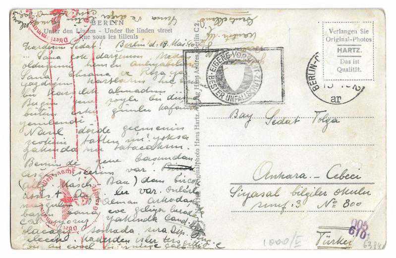 Berlin'den Ankara'ya gönderilmiş, damgalı, postadan geçmiş.