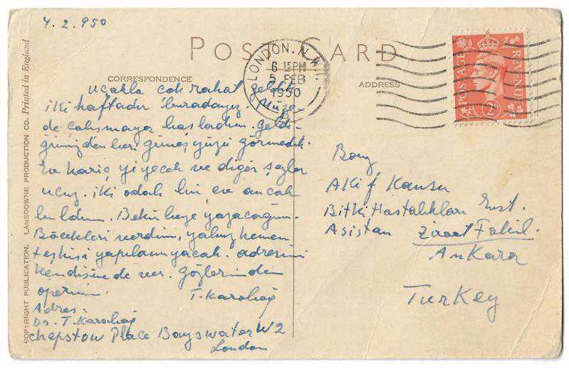 Londra Piccadilly Circus Meydanı, Ankara'ya gönderilmiş, postadan geçmiş, 1950 tarihli, pul ve damga var.