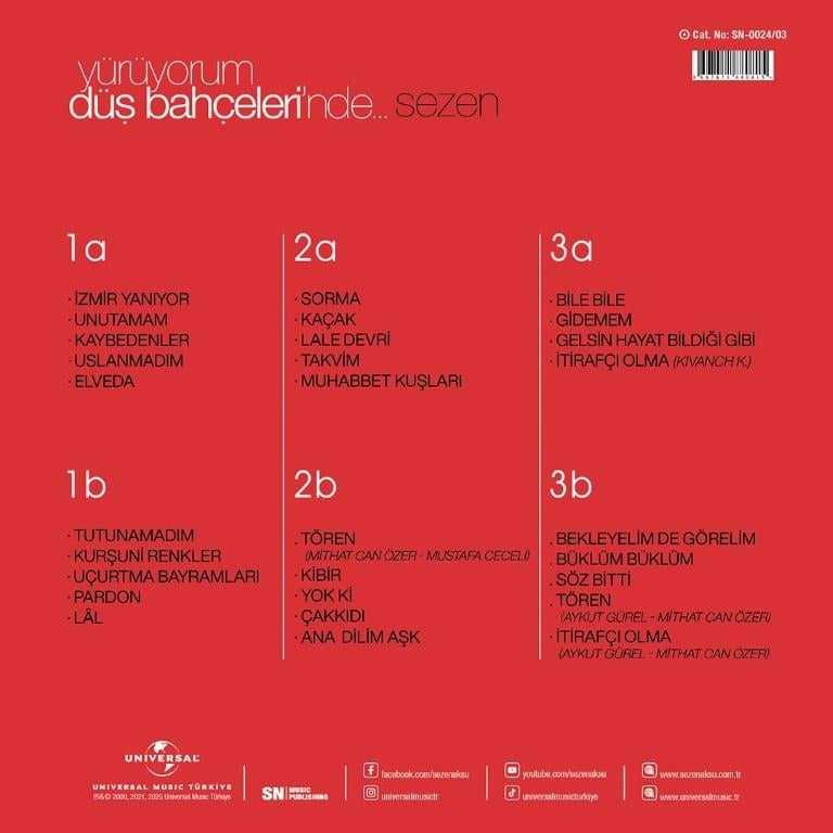 Yürüyorum Düş Bahçelerinde (3 Plak) Sezen Aksu - Sn Müzik / Universal Müzik Türkiye 2025 kullanılmamış yeni plak / LP, orijinal jelatinindedir plaklar özenle paketlenir ve plak için uygun kutularda kargolanır kargolama pazartesi, çarşamba ve cuma günleridir Plak İçeriği A1 İzmir Yanıyor A2 Unutamam A3 Kaybedenler A4 Uslanmadım A5 Elveda B1 Tutunamadım B2 Kurşuni Renkler B3 Uçurtma Bayramları B4 Pardon B5 Lâ'l C1 Sorma C2 Kaçak C3 Lale Devri C4 Takvim C5 Muhabbet Kuşları D1 Tören (Mithat Can Özer - Mustafa Ceceli) D2 Kibir D3 Yok Ki D4 Çakkıdı D5 Anadilim Aşk E1 Bile Bile E2 Gidemem E3 Gelsin Hayat Bildiği Gibi E4 İtirafçı Olma (Kıvanch K.) F1 Bekleyelim De Görelim F2 Büklüm Büklüm F3 Söz Bitti F4 Tören (Aykut Gürel - Mithat Can Özer) F5 İtirafçı Olma (Aykut Gürel - Mithat Can Özer)