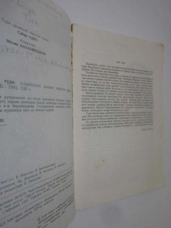 Eser Malik Allahverdiyev editörlüğünde hazırlanmıştır. Kitap 1991 yılında sunay tarafından [Bakü Баку] yayınlanmıştır. 128 sayfadır. Yüz Büyük Türk (Azerice kiril alfabesi) adlı eser Azerice dilindedir.