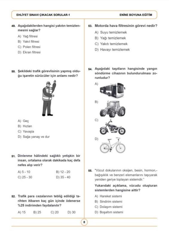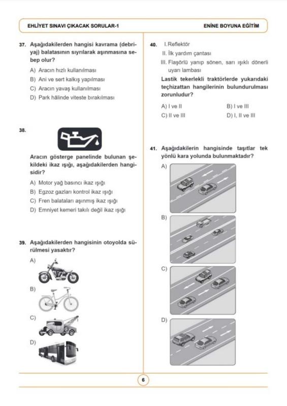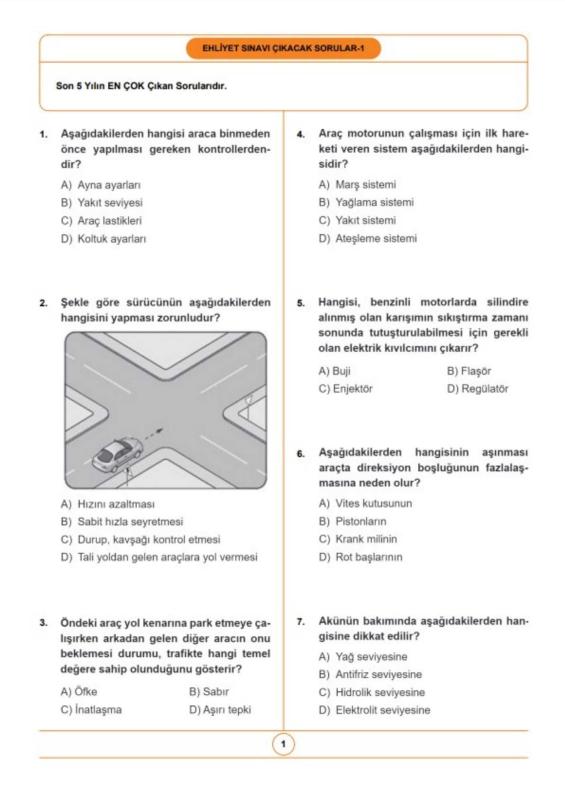 Yüzde Yüz Çıkacak Ehliyet Soruları Seti (1000 Soru + Ders Notları) Başka kaynağa ihtiyaç bırakmayan eğitim setidir. Ders Notlarını Oku, 10 Denemeyi çöz ve sınavda istediğin puanı al. Setimizi AL-ÇALIŞ-GEÇ Denemeler Gerçek Deneme Formatında ve Ders Notları Kitabı Büyük BOY ve Kolay Kullanım İçin Spiralli olarak hazırlanmıştır. Sizleri sınav öncesi gerçek sınav formuna sokmaktadır. Ders notlarını okuyacak ve konulara hakim olacaksınız. Sonra denemeleri çözüp cevaplarını denemelerin yanında verilecek optik forma işaretleyeceksiniz. Sonrada cevapları kontrol edeceksiniz. Son 5 yılın soruları bilgisayar sistemlerine yüklenerek en çok çıkanlardan oluşturulmuştur. Her son sınav soruları sisteme dahil olmaktadır. Ona göre denemeler güncellenmektedir. Kutu temsilidir. Satın aldığınızda 10 büyük boy deneme (Gerçek DENEME) almış olacaksınız. Denemelerin yanında Ders Notları Spiralli kitap gönderilmektedir. Her sınav sonrası GÜNCELLENEN Deneme Seti Setin içerisinde 10 gerçek deneme bulacaksınız. Her deneme için optik form verilmektedir. Cevapları optik form kağıdına işaretleyecek ve sonra cevap anahtarlarından kontrol edeceksiniz. 10.cu deneme sonunda %100 kazanacaksınız. 10 Deneme ve 1000 Sorudan Oluşmaktadır. Sorular Test Şeklinde ve cevapları verilmiştir. Kalem hediyelidir. Bu kitapla 1000 soruyu çözünce başka kaynağa ve soruya ihtiyaç duymayacaksınız. Her denemenin sonunda cevap anahtarları verilmiştir. Bazen çok çıkan sorular tekrar edilmiştir. Buda çıkma ihtimali yüksek olan sorulardır. Sizlerde %100 Ehliyet sınavlarında başarmak ve yüksek puan almak istiyorsanız bu kitap size göre. Kolay kullanım için spiralli olarak hazırlanmıştır. Yüzde Yüz Çıkacak Ehliyet Soruları Seti (1000 Soru + Ders Notları) Açıklamalar: Ders Notları Kitabı: Trafik Adabı Trafik Bilgisi İlk Yardım Motor Bilgisi Trafik İşaretleri Renkli Bölüm Deneme Açıklamaları: Deneme Sınavı-1 (100 Soru) Deneme Sınavı-2 (100 Soru) Deneme Sınavı-3 (100 Soru) Deneme Sınavı-4 (100 Soru) Deneme Sınavı-5 (100 Soru) Deneme Sınavı-6 (100 Soru) Deneme Sınavı-7 (100 Soru) Deneme Sınavı-8 (100 Soru) Deneme Sınavı-9 (100 Soru) Deneme Sınavı-10 (100 Soru)