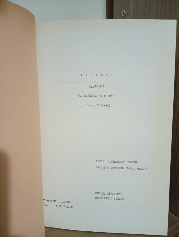 Yüzyüze (Başbaşa) oyun, 2 perde = na yediniye sa fsemi / Aleksander Gelman | Teksir Sahne Metni (Daktilo) | Devlet Tiyatrosu Dramaturgi Bürosu 1984 adlı eser, Kitap > Sanat > Sahne Sanatları > Tiyatro kategorisinde İkinci El olarak satıştadır.