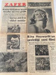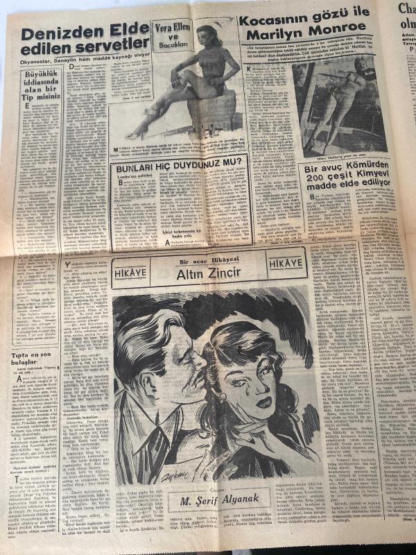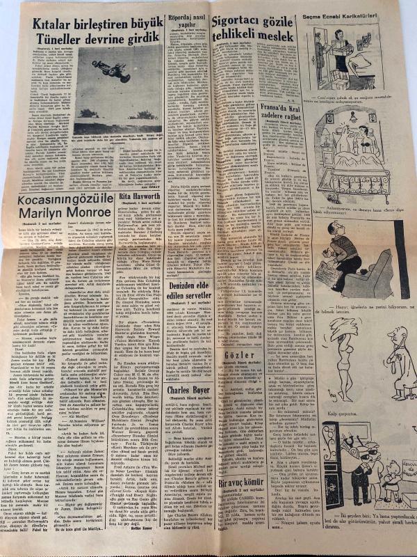 ZAFER GAZETESİ HAFTA SONU İLAVESİ DOĞUM GÜNÜ HEDİYESİ- 5 TEMMUZ 1953 - TURKİSH NEWSPAPER -Rita Hayworth-Marilyn Monroe-Vera Ellen-Charles Boyer-M. Şerif Alyanak-Pat Cummings-Michael-Somerset Maugham-Kont Humberstone-Prenses Helene-Prenses Elizabeth-Kral Baudouin-Rahibe Elizabeth-Murat Girey-Zuhal Kartal- Kıtalar birleştiren büyük tüneller devrine girdik-Sigortacı gözü ile en tehlikeli meslekler-Denizden elde edilen servetler-Kocasının gözü ile Marilyn Monroe-Rita Hayworth’un çevirdiği yeni filmi-Röportaj nasıl yapılır-Bir avuç kömürden 200 çeşit kimyevi madde elde ediliyor-Bunları hiç duydunuz mu?-Altın Zincir-Charles Boyer Don Juan olmaktan niçin vazgeçti?-Gözler-Fransa’da kral zadelere rağbet-Marilyn Monroe’nun tahtı tehlikeye girdi-Seçme ecnebi karikatürleri adlı eser, Kitap > Süreli Yayınlar > Gazeteler > Türkiye > Genel > Günlük kategorisinde İkinci El olarak satıştadır.