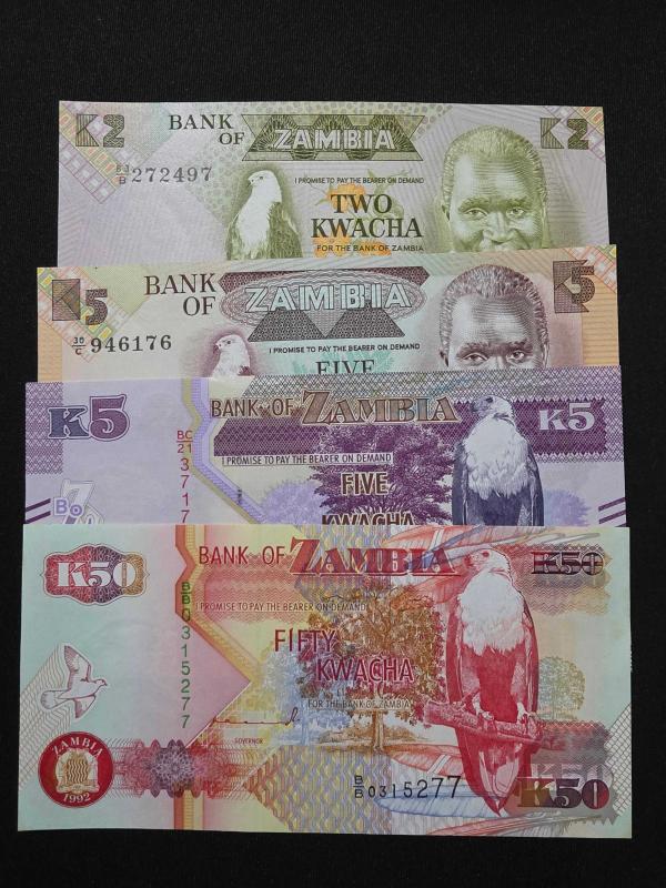 ZAMBİA 2-5-5-50 KWACHA, 1992/2021, ÇİL Toplam 4 banknot, bir ay önce satışa sunulmuştur.