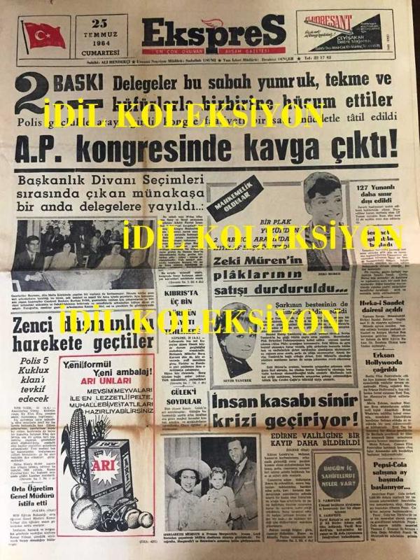 ZEKİ MÜREN'İN PLAKLARININ SATIŞI DURDURULDU, 25 TEMMUZ 1964 EKSPRES GAZETESİ - ZENCİ DÜŞMANLARI HAREKETE GEÇTİLER, A.P KONGRESİNDE KAVGA ÇIKTI, ARI PİRİNÇ UNU REKLAMI, PRENSES MARGARETH, SEVİM TANÜREK, BELEDİYE UMUMİ HELALARI KİRAYA VERMEYE BAŞLADI, OSMAN ÇELİKLER, REŞAT İLERİ ''BÜYÜK AKINCILAR'' SEVDA FERDAĞ ''ALİ DERLER ADIMA'' FİLMİ, EŞREF KOLÇAK, DİŞİ KAZANOVA ÇİZGİROMAN, AYHAN BAŞOĞLU, GRİPİN REKLAMI, METİN OKTAY, KADRİ ŞEREF, SPOR-TOTO YILLIK GELİRİ 123 MİLYONU BULDU, adlı eser, Kitap > Süreli Yayınlar > Gazeteler > Türkiye kategorisinde İkinci El olarak satıştadır.