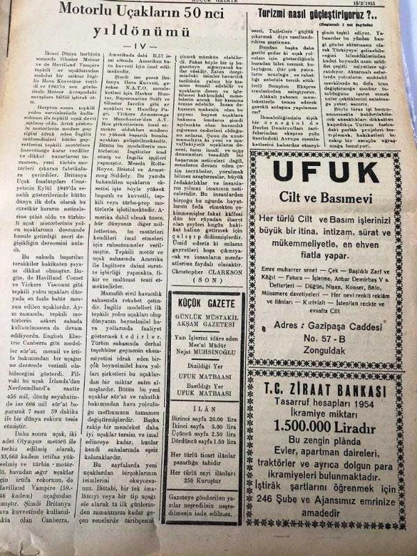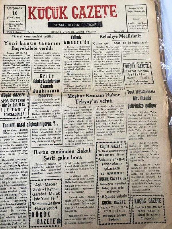 ZONGULDAK KÜÇÜK GAZETE YEREL TAŞRA BASINI - 16 Şubat 1955 YIL :3 SAYI :398- Ticaret Kanundaki Tadilat Yeni kanun tasarısı başvekalete verildi-Grizu felaketzedelerine Osmanlı Bankasının Teberru ---Valimiz Amasra da -Meşhur Kemani Nubar Tekyay 'ın Vefatı - Motorlu Uçakların 50 .Yıl Dönümü Yıpranma, sararmalar, kupon kesiği ve yırtılmalar zamana bağlı olarak görülebilir.