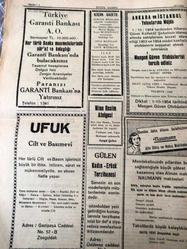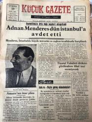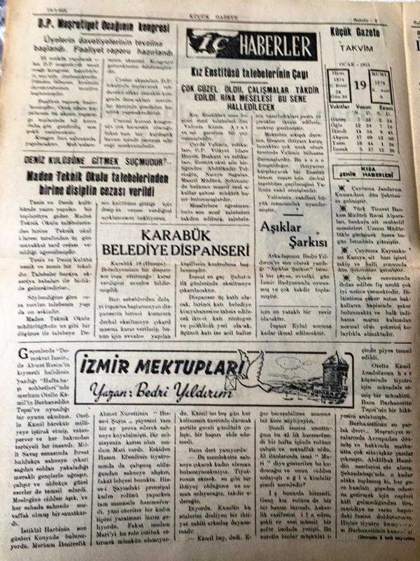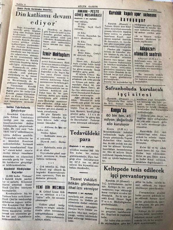 ZONGULDAK KÜÇÜK GAZETE YEREL TAŞRA BASINI - -19 Ocak 1955 Yıl :3 Sayı :380- Adnan Menderes dün İstanbul 'a avdet etti - Amasra 'nın İmar Planı - Demokrat Parti Meşrutiyet Ocağının Kongresi - Deniz Kulübüne Gitmek Suç Mudur ? Karabük Belediye Dispanseri - Kız Enstitüsü Talebelerinin Çayı Çok Güzel Oldu -İzmir Mektupları Yazan : Bedri Yıldırım - Din katliamı devam ediyor - Karabük Kapalı Spor Salonuna Kavuşuyor - Safranbolu da kurulacak işçi sitesi - Yıpranma, sararmalar, kupon kesiği ve yırtılmalar zamana bağlı olarak görülebilir.
