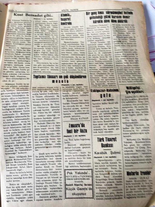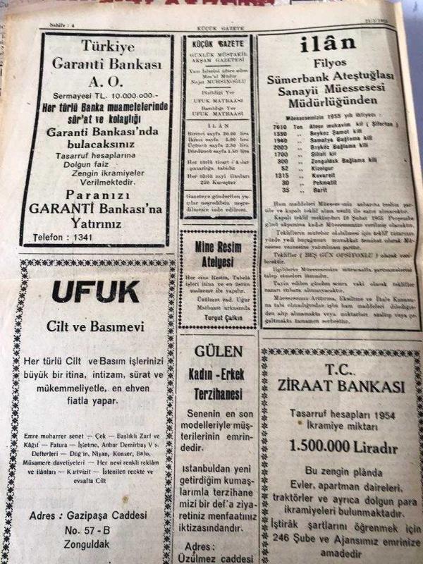 ZONGULDAK KÜÇÜK GAZETE YEREL TAŞRA BASINI - - 21 OCAK 1955 -YIL :3 SAYI :382- Valimiz yarın Ereğli 'ye gidiyor Kazım ARAT 'ın Avdette Devrek 'e Uğraması Muhtemeldir - Kont Bernadot gibi ... yazan :Nejat Muhsinoğlu - Demokrat Parti Meşrutiyet Ocağının Kongresi -Kira kanunun son şeklini aldı - Amasra da feci işçisi sitesi - İç Haberler : Gülhane parkı altıncı çiçek ve bahar bayramı bu yıl 20 Mayıs da başlayacak - Yıpranma, sararmalar, kupon kesiği ve yırtılmalar zamana bağlı olarak görülebilir.