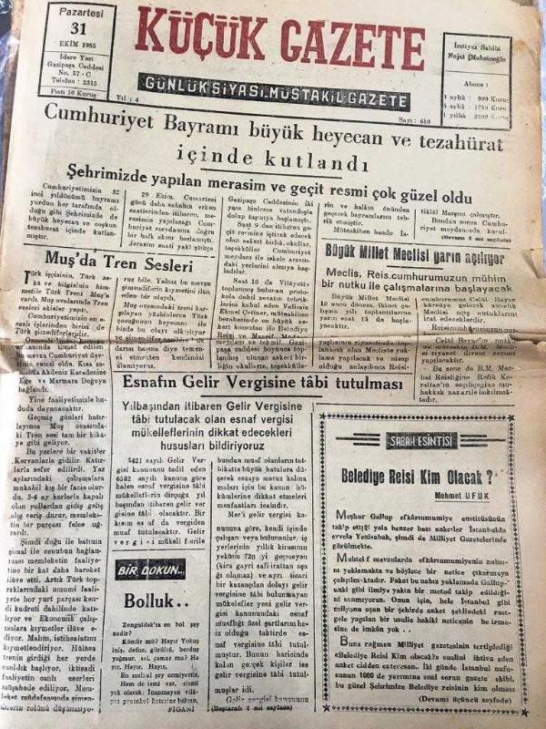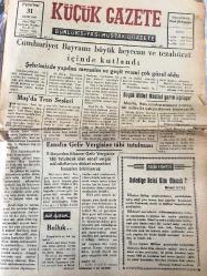 ZONGULDAK KÜÇÜK GAZETE YEREL TAŞRA BASINI - 31 Ekim 1955 YIL :4 SAYI :610- Cumhuriyet Bayramı Büyük Heyecan Ve Tezahürat İçinde Kutlandı -Muş 'ta Tren Sesleri - Esnafın Gelir Vergisine Tabi Tutulması - Sabah Reisi Kim Olacak ? Mehmet Ufuk -İç Haberler : Şehir merkez cezaevindeki müsamere - Zonguldak Belediyesinden -Spor -Şehrimizde Cumhuriyet Bayramı maçlarında Galatasaray amatör takımı bir galibiyet bir mağlubiyet aldı -İstanbul Link Maçları - Röportaj -Gece yarısından sonra Beyoğlu Yıpranma, sararmalar, kupon kesiği ve yırtılmalar zamana bağlı olarak görülebilir.