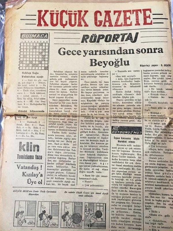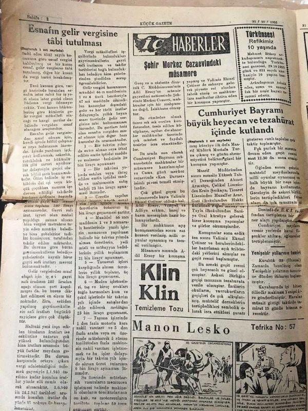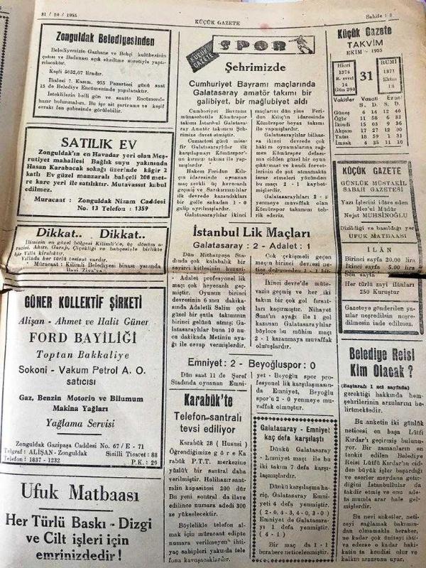 ZONGULDAK KÜÇÜK GAZETE YEREL TAŞRA BASINI - 31 Ekim 1955 YIL :4 SAYI :610- Cumhuriyet Bayramı Büyük Heyecan Ve Tezahürat İçinde Kutlandı -Muş 'ta Tren Sesleri - Esnafın Gelir Vergisine Tabi Tutulması - Sabah Reisi Kim Olacak ? Mehmet Ufuk -İç Haberler : Şehir merkez cezaevindeki müsamere - Zonguldak Belediyesinden -Spor -Şehrimizde Cumhuriyet Bayramı maçlarında Galatasaray amatör takımı bir galibiyet bir mağlubiyet aldı -İstanbul Link Maçları - Röportaj -Gece yarısından sonra Beyoğlu, NEJAT MUHSİNOĞLU tarafından kaleme alınmıştır. Kitap 1952 yılında [UFUK MATBAASI ] yayınlanmıştır. 4 sayfadır. ZONGULDAK KÜÇÜK GAZETE YEREL TAŞRA BASINI - 31 Ekim 1955 YIL :4 SAYI :610- Cumhuriyet Bayramı Büyük Heyecan Ve Tezahürat İçinde Kutlandı -Muş 'ta Tren Sesleri - Esnafın Gelir Vergisine Tabi Tutulması - Sabah Reisi Kim Olacak ? Mehmet Ufuk -İç Haberler : Şehir merkez cezaevindeki müsamere - Zonguldak Belediyesinden -Spor -Şehrimizde Cumhuriyet Bayramı maçlarında Galatasaray amatör takımı bir galibiyet bir mağlubiyet aldı -İstanbul Link Maçları - Röportaj -Gece yarısından sonra Beyoğlu adlı eser Türkçe dilindedir.