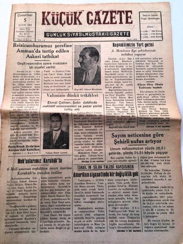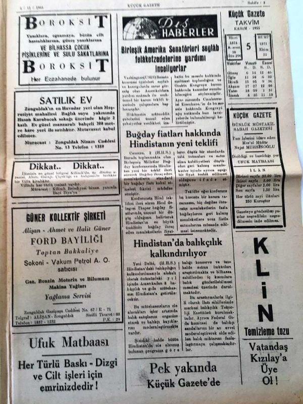 ZONGULDAK KÜÇÜK GAZETE YEREL TAŞRA BASINI - 5 KASIM 1955 YIL :4 SAYI :615- Reisicumhurumuz şerefine Amman da tertip edilen askeri tatbikat--Valimizin dünkü tetkikleri -Mebuslarımız Karabük 'te - -Başvekilimizin Yurt Gezisi - İsrail 'in silah talebi karşısında Amerikan Siyasetinde Bir Değişiklik Yok - Amaç 'ın Mukavelesi Feshedildi ---İç Haberler - Belediye Apartmanlarının Altındaki Dükkanlar - Amerika ,Komünist Çin 'in diğer 17 Amerikalıyı da Serbest Bırakacağını Ümit Ediyor --Dış Haberler : Birleşik Amerika Senatörleri Seylab Felaketzedelerine Yardım İnceliyor - -Buğday fiyatlarında hakkında Hindistan 'nın yeni teklifi - Hindistan da balıkçılık kalkındırılıyor - KEHANET Alman basınından çeviren :ALİ Ülkü - Yıpranma, sararmalar, kupon kesiği ve yırtılmalar zamana bağlı olarak görülebilir.
