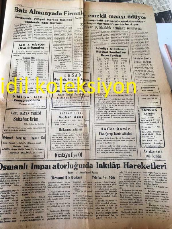 ZONGULDAK SANCAK GAZETESİ YEREL TAŞRA BASINI --16 Aralık 1963 Yıl :2 Sayı :533---İnönü yeni koalisyon için evet derse mesele yok --Türkiye İşçi Partisi İl Başkanı H. Likoğlu Memlekette Ferah Yolları --Perşembe Nahiyesi Elektriğe Kavuşuyor --Bir Sendikacının Sözleri ve Zonguldak : Tuğrul Dağcı --İnönü 'nün Gürsel 'e Bugün kü Cevabı Ne Olabilir ?--Verimle Çalışan Bir Sendika -- Batı Almanya da Firmalar Emekli Maaşı Ödüyor---Osmanlı İmparatorluğunda İnkılap Hareketleri :Ahmet Bedevi Kuran --AP .Merkez ilçe Kongresi Dün Yapıldı --- Yıpranma, sararmalar, kupon kesiği ve yırtılmalar zamana bağlı olarak görülebilir.