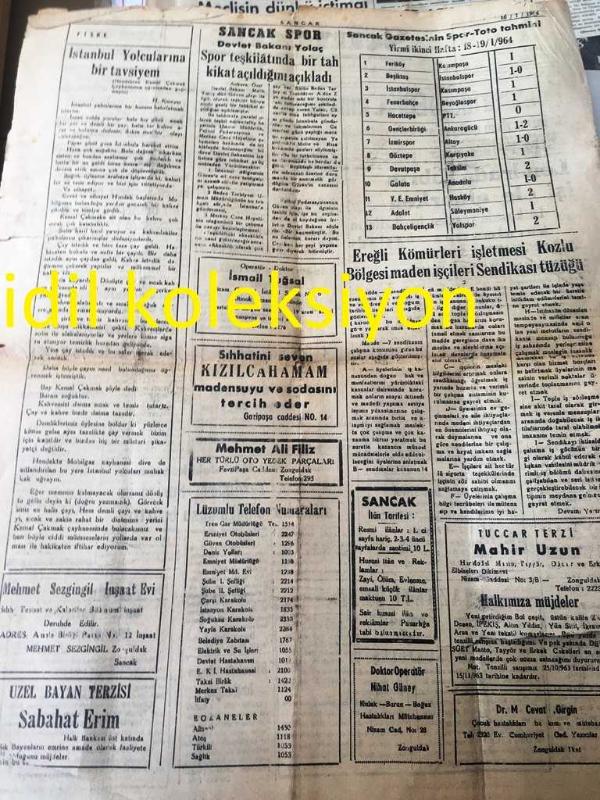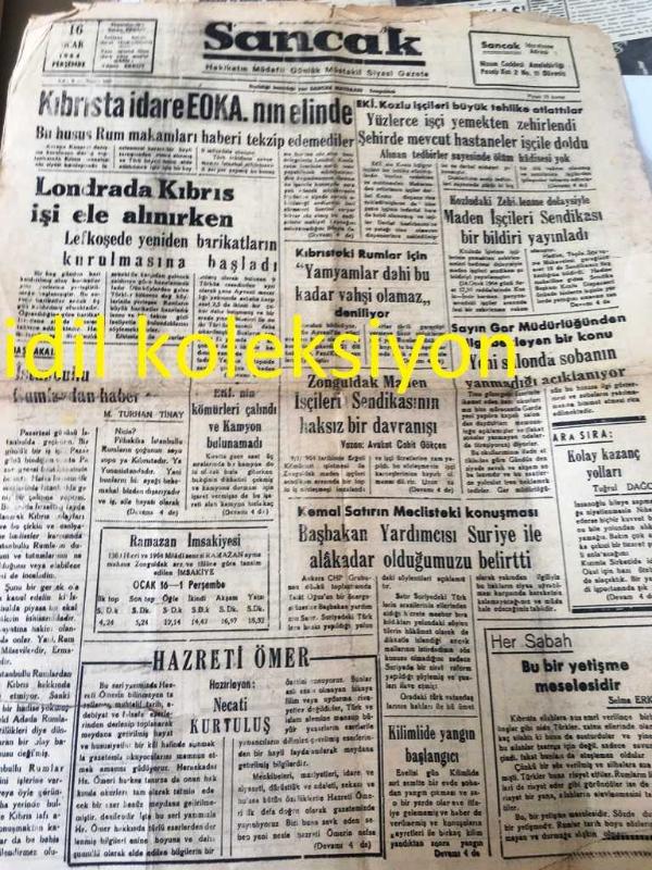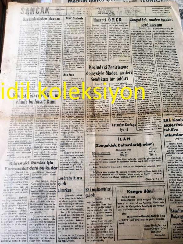 ZONGULDAK SANCAK GAZETESİ YEREL TAŞRA BASINI --16 Ocak 1964 Yıl :2 Sayı :560--Kıbrıs 'ta idare EOKA nın elinde --Londra da Kıbrıs İşi Ele Alınırken --Kozlu da ki Zehirlenme Dolayısıyla Maden İşçileri Sendikası Bir Bildiri Yayınladı -- Bu Bir Yetiştirme Meselesidir :Selma Erkut --Kemal Satırın Meclisteki Konuşması Başbakan Yardımcısı Suriye ile Alakadar Olduğumuzu Belirtti --Hazreti Ömer :Necati Kurtuluş --Sancak Spor Devlet Bakanı Yolaç Spor Teşkilatında Bir Tahkikat Açıldığını Açıkladı --Operatör -Doktor :İsmail Tuğsal -- Yıpranma, sararmalar, kupon kesiği ve yırtılmalar zamana bağlı olarak görülebilir.