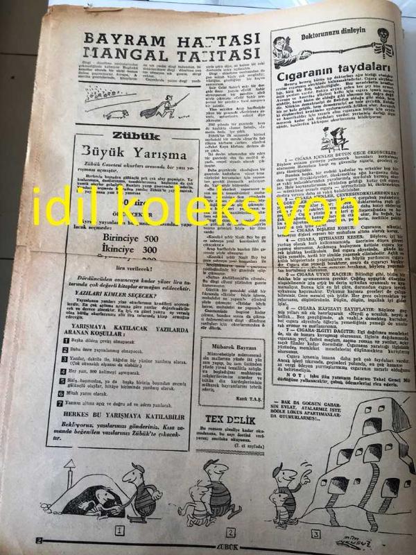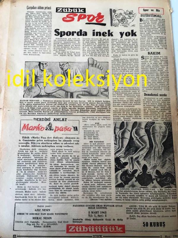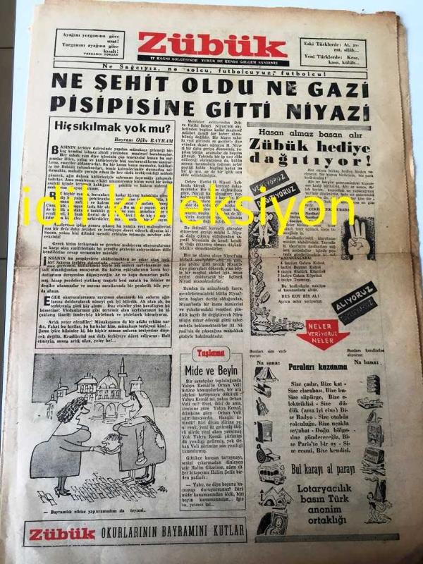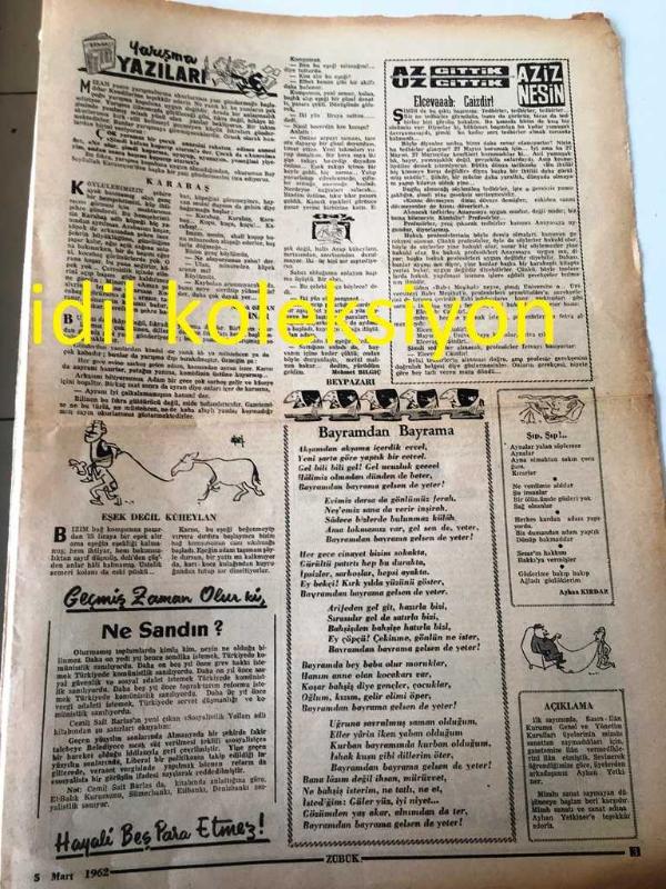 ZÜBÜK GAZETESİ YEREL TAŞRA BASINI NE SAĞCIYIZ NE SOLCU ,FUTBOLCUYUZ ,FUTBOLCU --5 MART 1962 --Ne Şehit Oldu Ne Gazi Pisipisine Gitti Niyazi --Hiç Sıkılmak Yok Mu ? Bayram oğlu Bayram --Hasan almaz basan alır Zübük Hediye Dağıtıyor -Karabaş :Namık Özkan Dinar --Az gittik uz gittik Eşcevaab Caizdir :Aziz Nesin --Aziz Nesin den Bir Hikaye ---Biz Adam Olamayız : Azizi Nesin --Alelade Harikulede :Hüseyin Korkmazgil --Amerikalılar diyor ki --Günahını Satan Adam :---Dünya mizahından örnekler :Yazan :Taschrak ---Derdini anlat marko paşa ya --Spor da inek yok -- Yıpranma, sararmalar, kupon kesiği ve yırtılmalar zamana bağlı olarak görülebilir.