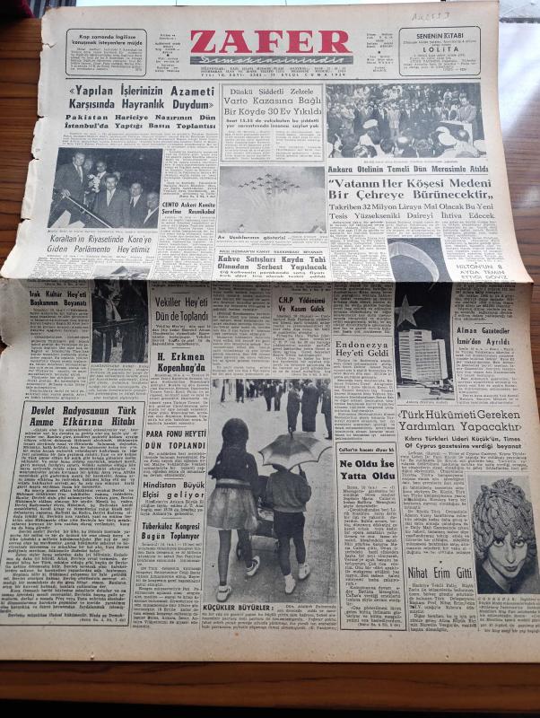 Zafer Gazetesi - 11 Eylül Cuma - Pakistan Hariciye Nazırı Manzur Kadir İstanbul'da Yaptığı Basın Toplantısı - Refik Koraltan'ın Riyasetinde Kore'ye Giden Parlamento Heyetimiz - CENTO Askeri Komite Şerefine Resmi Kabul - Dün Şiddetli Zelzele Varto Kazasına Bağlı Bir Köyde 30 Ev Yıkıldı - Ankara Otelinin Temeli Dün Merasimle Atıldı - Hilton Oteli'nin 8 Ayda Temin Ettiği Döviz - Kıbrıs Türkleri Lideri Fazıl Küçük Türk Hükümeti Gerekeni Yapacaktır - Av Uçaklarının Gösterisi - Çubuk Barajının İkinci Su İsale Hattı Açıldı - Tahran Atom Merkezinde Dört Öğrenci Staj Görecek - Peygamber Sevgisi Yazan Ragıp Akyavaş - Sovyet Başvekili Kruşçef'in Amerika'yı Ziyareti Hazırlığı - Kırgızistan'da Yüksek Medeniyette Türk Şehri - Avrupa Halkları Ansiklopedisi - Luis Alberto Del Parana Ankara Palas Salonunda - Fenerbahçe'nin Rakibi Csepel Bugün İstanbul'a Geliyor - Şekerhilal ve 6 Ankaragücülü Futbolcu Kampa Girdiler - Fuar Kupası Maçlarına Bugün İzmir'de Başlanıyor - Vita Yağ - Türkiye Emlak Kredi adlı eser, Kitap > Süreli Yayınlar > Gazeteler > Türkiye > Genel > Günlük kategorisinde İkinci El olarak satıştadır.