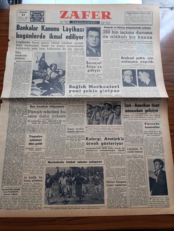 Zafer Gazetesi - 15 Eylül 1954 - Mümtaz Faik Fenik Köşe Yazısı - Bankalar Kanunu Layihası Bugünlerde İkmal Ediliyor - Erkanı Harbiyei Umumiye Reisi Orgeneral Nurettin Baransel Atina'ya Gidiyor - Hilmi Şahenk Tarafından Hazırlanan Zirai Kalkınmamızı Anlatan Resim Sergisi - Yugoslav Atletleri Dün Geldi - Avrupalararası Birlik Başkanı Richard Coudenhove Kalergi Atatürk'ü Örnek Gösteriyor - Liselerin 11 Sınıfa Binmesi - Brüksel Paktı İçin Anlaşma Yapıldı - Harbokulu Futbol Takımı Çalışıyor- Şair Nigar Hanım Yazan Mehmet Orhan Seyfi Orhon Köşe Yazısı - Kıbrıs Türktür Komiteleri - Dünya Muallimler Kongresi 1955 de Türkiye'de Yapılacak - Dış Mahalle Yazan G. Simenon Yazı Dizisi - Amerikan Ordusu Genel Kurmay Başkanı General Ridgway Yakın Bir Harbe İnanmıyor - Azra Hayri Vefat Etti - Küçük Tiyatroda İmtihanlar - Hiroşima'da Atom Bombasından Ölenlerin Varisleri Amerika'yı Davet Ettiler - İkiz Dünya Başka Alemlerde Bir Macera Çizgi Roman - Cemiyet Hayatı - Ölüm Hücresi 2455 Yazan Caryl Chessman adlı eser, Kitap > Süreli Yayınlar > Gazeteler > Türkiye > Genel > Günlük kategorisinde İkinci El olarak satıştadır.