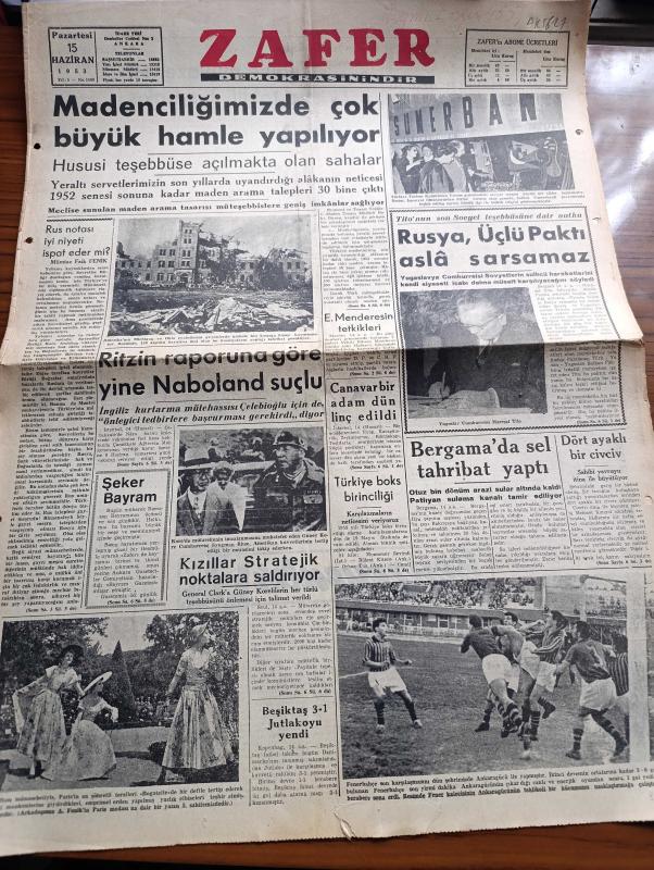 Zafer Gazetesi - 15 Haziran 1953 - Rus Notası İyi Niyeti İspat Eder Mi Yazan Mümtaz Faik Fenik Köşe Yazısı - Fenerbahçe Ankaragücü Maçı 3 3 Maçtan Bir Kare - Madenciliğimizde Çok Büyük Bir Hamle Yapılıyor - Mareşal Tito'nun Son Sovyet Teşebbüsüne Dair Nutku Rusya Üçlü Paktı Asla Sarsamaz - Ritzin Raporuna Göre Yine Naboland Suçlu - Şeker Bayramı - Kore'de Kızıllar Stratejik Noktalara Saldırıyor - Beşiktaş Danimarka'nın Tanınmış Takımı Jutlako'yu Yendi - Benzeyenler Yazan Necdet Asi Yazı işleri - Şehir Tiyatrosu Hafta İçinde Gidiyor - Mısır Başvekili General Necip - Mısırın Yeni Hükümet Şekli - Hong Kong İncisi Anlatan Harry Feller Yazı Dizisi - Milyoner Erkek Nasıl Avlanır Marilyn Monroe'nun Formülü - Amerika Röportajları Yazan Fatin Fuad Yazı Dizisi - Paris'te Yaz Modaları - Kraliçe İkinci Elizabeth Bir Geçit Resminde - Fenerbahçe Takımı Bitkin Durumdadır - At Yarışları Bugünkü Koşular adlı eser, Kitap > Süreli Yayınlar > Gazeteler > Türkiye > Genel > Günlük kategorisinde İkinci El olarak satıştadır.