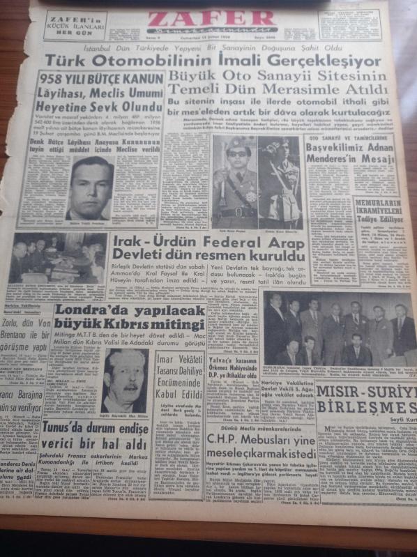 Zafer Gazetesi - 15 Şubat 1958 - Türk Otomobilinin İmali Gerçekleşiyor - Büyük Oto Sanayii Sitesinin Temelli Dün Merasimle Atıldı - Irak Ürdün Federal Arap Devleti Dün Resmen Kuruldu - Irak Kralı Faysal - Ürdün Kralı Hüseyin - Londra'da Yapılacak Büyük Kıbrıs Mitingi - Fatin Rüştü Zorlu Dün Von Brentano İle Bir Görüşme Yaptı - Ayrancı Barajına Bugün Su Veriliyor - Fazıl Ahmet Aykaç- Feza'nın Fethi - Manchester United'ın Kazadan Sonra İlk Transferi - Florence Nightingale Tesisinin Temeli Mayıs'da Atılıyor - Makine ve Kimya Endüstrisi Kurumu - Bugün Fenerbahçe İstanbulspor'u Gol Yemeden Yenebilir Mi - Güreşte Ankara Helsinki Karmasını 8 0 Mağlup Etti - Şehzade Orhan Tarihi Aşk Ve Macera Romanı, Cenap Yakar tarafından kaleme alınmıştır. Zafer Gazetesi - 15 Şubat 1958 - Türk Otomobilinin İmali Gerçekleşiyor - Büyük Oto Sanayii Sitesinin Temelli Dün Merasimle Atıldı - Irak Ürdün Federal Arap Devleti Dün Resmen Kuruldu - Irak Kralı Faysal - Ürdün Kralı Hüseyin - Londra'da Yapılacak Büyük Kıbrıs Mitingi - Fatin Rüştü Zorlu Dün Von Brentano İle Bir Görüşme Yaptı - Ayrancı Barajına Bugün Su Veriliyor - Fazıl Ahmet Aykaç- Feza'nın Fethi - Manchester United'ın Kazadan Sonra İlk Transferi - Florence Nightingale Tesisinin Temeli Mayıs'da Atılıyor - Makine ve Kimya Endüstrisi Kurumu - Bugün Fenerbahçe İstanbulspor'u Gol Yemeden Yenebilir Mi - Güreşte Ankara Helsinki Karmasını 8 0 Mağlup Etti - Şehzade Orhan Tarihi Aşk Ve Macera Romanı adlı eser Türkçe dilindedir.