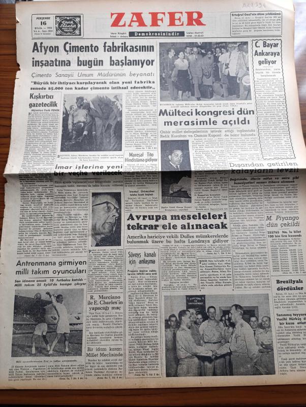 Zafer Gazetesi - 16 Eylül 1954 - Afyon Çimento Fabrikasının İnşaatına Bugün Başlanıyor - Mümtaz Faik Fenik Köşe Yazısı - Mülteci Kongresi Dün Merasimle Açıldı - Mareşal Tito Hindistana Gidiyor - Devlet Vekili Osman Kapani Konuşmasını Yaparken - Rocky Marciano İle Ezzard Charles'in Yapacağı Boks Maçı - Antrenmana Girmeyen Milli Takım Oyuncuları - Milli Oyuncularımızdan Erol Ve Lefter Antremanda - Paris Kasabı Alman General Karl Oberg'in Duruşması - Tanınmış Tayyareci Vecihi Hürkuş Dün Bir Kaza Atlattı - Süveyş Kanalı İçin Anlaşma - Dış Mahalle Yazan G. Simenon Yazı Dizisi - Orhan Seyfi Orhon Köşe Yazısı - Siirt Lisesi Önümüzdeki Ders Yılında Faaliyete Geçecek - Suriye'de Dün Kanlı Bir Çarpışma Oldu - San Nikola Baskını - Kanlı Ayinler - İkiz Dünya Başka Alemlerde Bir Macera Çizgi Roman - Ankara İstanbul İzmir Radyosu Programı - Ölüm Hücresi 2455 Yazan Carly Chessman Yazı Dizisi - Venedik Film Festivali - Federal Almanya Gizli İstihbarat Şefi Otto John'un Esrarengiz Firarı - Caltex Yağ adlı eser, Kitap > Süreli Yayınlar > Gazeteler > Türkiye > Genel > Günlük kategorisinde İkinci El olarak satıştadır.