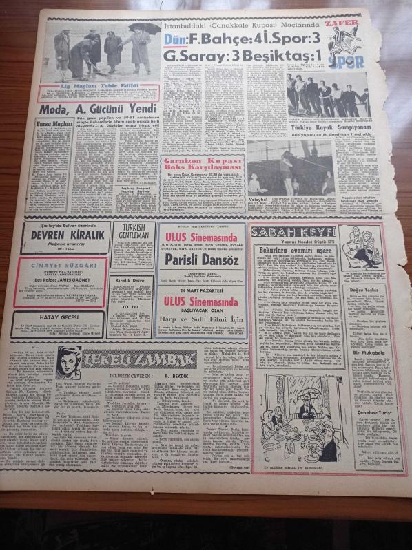 Zafer Gazetesi - 17 Mart 1958 - Nafia Vekili Tevfik İleri Demokrat Parti'nin İktidarının Verimli Gayretlerini Belirtti - Batan Üsküdar Vapuru Bu Cuma Çıkarılacak - Amerika Aya Peyk Gönderecek - Öğretmen Okullarının Kuruluş Yıldönümü - Birleşik Arap Cumhuriyeti Başkanı Cemal Abdünnasır Arap Birliğine Dair Konuşma Yaptı - 15 Günlük Ücretli İzin İçin Kanun Layihası Hazırlandı - Kırım Türkleri Kültür Ve Yardımlaşma Cemiyeti - Sophia Loren'e Karşı Boykot - Sinema Tiyatro Derneğinin Kongresi - Türk Hava Kurumu Kongresi - Feza Yolcuları Yazı Dizisi - At Yarışları - Piyale Makarnası - Yağmur Sebebiyle Lig Maçları Tehir Edildi - Garnizon Kupası Boks Karşılaşması - İstanbul'daki Çanakkale Kupası - Galatasaray Beşiktaş'ı Yendi - Türkiye Kayak Şampiyonası - Ulus Sineması, Cenap Yakar tarafından kaleme alınmıştır. Zafer Gazetesi - 17 Mart 1958 - Nafia Vekili Tevfik İleri Demokrat Parti'nin İktidarının Verimli Gayretlerini Belirtti - Batan Üsküdar Vapuru Bu Cuma Çıkarılacak - Amerika Aya Peyk Gönderecek - Öğretmen Okullarının Kuruluş Yıldönümü - Birleşik Arap Cumhuriyeti Başkanı Cemal Abdünnasır Arap Birliğine Dair Konuşma Yaptı - 15 Günlük Ücretli İzin İçin Kanun Layihası Hazırlandı - Kırım Türkleri Kültür Ve Yardımlaşma Cemiyeti - Sophia Loren'e Karşı Boykot - Sinema Tiyatro Derneğinin Kongresi - Türk Hava Kurumu Kongresi - Feza Yolcuları Yazı Dizisi - At Yarışları - Piyale Makarnası - Yağmur Sebebiyle Lig Maçları Tehir Edildi - Garnizon Kupası Boks Karşılaşması - İstanbul'daki Çanakkale Kupası - Galatasaray Beşiktaş'ı Yendi - Türkiye Kayak Şampiyonası - Ulus Sineması adlı eser Türkçe dilindedir.