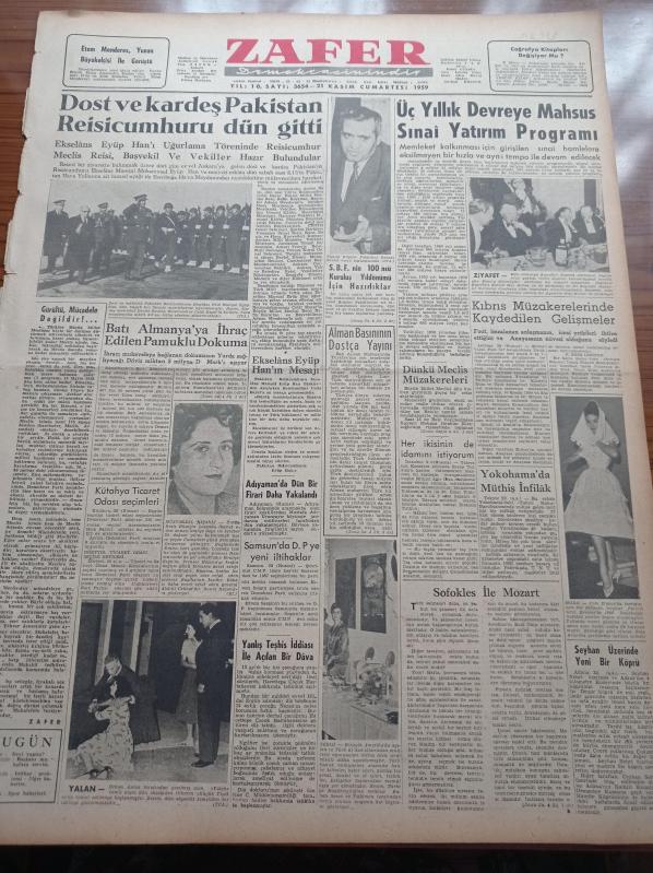 Zafer Gazetesi - 21 Kasım 1959 - Dost Ve Kardeş Pakistan Reisicumhuru Eyüp Han Dün Gitti - Siyasal Bilgiler Fakültesi 100. Kuruluş Yıldönümü İçin Hazırlıklar - Üç Yıllık Devreye Mahsus Sınai Yatırım Programı - Kıbrıs Müzakerelerinde Kaydedilen Gelişmeler - Yokohama'da Müthiş İnfilak - Samsun'da Demokrat Parti'ye Yeni İltihaklar - Sofokles İle Mozart - Fuad Pekin'e 1. Leopold Nişanı Verildi - Oidipus Büyük Tiyatroda Temsillerine Başladı - Riyaseticumhur Senfoni Orkestrası Konser Verecek - Nükleer Denemelere Tekrar Başlanacak Mı - Büyük Çöl Atom Denemesine Karşı - Fezada Amerikan Sovyet İşbirliği - Piyale Makarnası - Air France- Samsun Güven Otobüsleri - UFA Mutbak Margarini - Sungurlar Kazan Ve Teshin Cihazları Fabrikası - Bu Gece Ankara Bavyera Boks Karşılaması - Beşiktaş Dün Geldi, Cenap Yakar tarafından kaleme alınmıştır. Zafer Gazetesi - 21 Kasım 1959 - Dost Ve Kardeş Pakistan Reisicumhuru Eyüp Han Dün Gitti - Siyasal Bilgiler Fakültesi 100. Kuruluş Yıldönümü İçin Hazırlıklar - Üç Yıllık Devreye Mahsus Sınai Yatırım Programı - Kıbrıs Müzakerelerinde Kaydedilen Gelişmeler - Yokohama'da Müthiş İnfilak - Samsun'da Demokrat Parti'ye Yeni İltihaklar - Sofokles İle Mozart - Fuad Pekin'e 1. Leopold Nişanı Verildi - Oidipus Büyük Tiyatroda Temsillerine Başladı - Riyaseticumhur Senfoni Orkestrası Konser Verecek - Nükleer Denemelere Tekrar Başlanacak Mı - Büyük Çöl Atom Denemesine Karşı - Fezada Amerikan Sovyet İşbirliği - Piyale Makarnası - Air France- Samsun Güven Otobüsleri - UFA Mutbak Margarini - Sungurlar Kazan Ve Teshin Cihazları Fabrikası - Bu Gece Ankara Bavyera Boks Karşılaması - Beşiktaş Dün Geldi adlı eser Türkçe dilindedir.