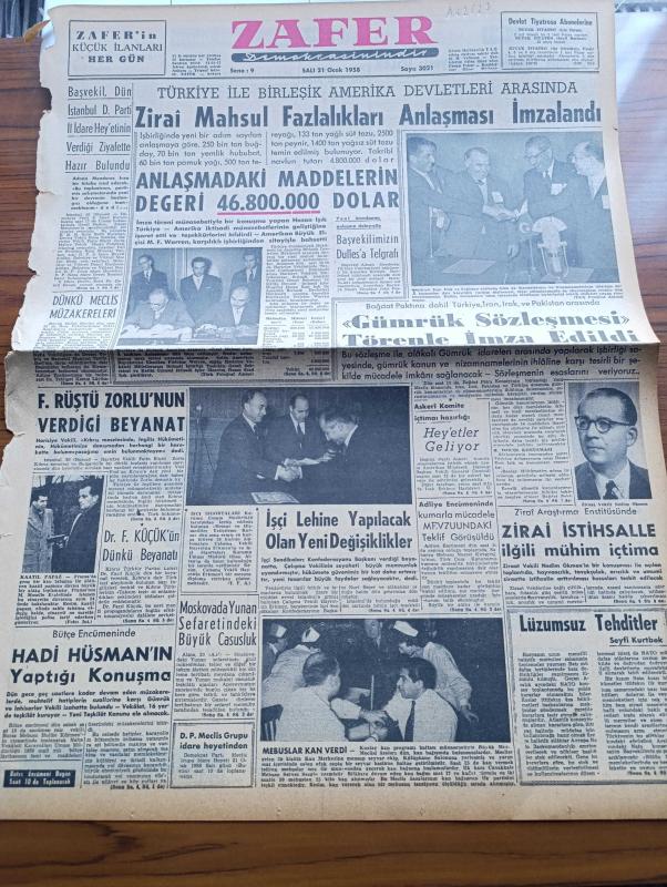 Zafer Gazetesi - 21 Ocak 1958 - Türkiye İle Birleşik Amerika Devletleri Arasında Zirai Mahsul Fazlalıkları Anlaşması İmzalandı - Başvekil Adnan Menderes İstanbul Demokrat Parti İl İdare Heyetinin Verdiği Ziyarette Bulundu - Bağdat Paktına Dahil Türkiye İran Irak Ve Pakistan Arasında Gümrük Sözleşmesi Törenle İmza Edildi - Fatih Rüştü Zorlu'nun Verdiği Beyanat - Ziraat Vekili Nedim Ökmen - Seyfi Kurtbek Köşe Yazısı - Mebuslar Kan Verdi - Moskova'da Yunan Sefaretinde Büyük Casusluk - Misket Yazan Münir Müeyyet Bekman Yazı Dizisi - Radyo Ve Haberler Yazan Hikmet Münir Ebcioğlu - Stratejik Hazırlıkların Gayesi Üsler - Ragıp Akyavaş - Film Yıldızı Model Ve Kontes Elsa Martinelli - Oleyis Sendikası Sekreterine Cevap - Kaybolan Yıllar Türk Filmi Park Sus Sinemasında - Tanınmış Yazar François Sagan Evleniyor - Şehzade Orhan Tarihi Aşk ve Macera Romanı - Ferdi Amcanın Maceraları Çizgi Roman - Dünya Ağır Siklet Güreş Şampiyonu Hamit Kaplan 27 Ocakta Ameliyatı Olacak - Seyfi Cenap Berksoy, Zühtü Hilmi Velibeşe tarafından kaleme alınmıştır. Zafer Gazetesi - 21 Ocak 1958 - Türkiye İle Birleşik Amerika Devletleri Arasında Zirai Mahsul Fazlalıkları Anlaşması İmzalandı - Başvekil Adnan Menderes İstanbul Demokrat Parti İl İdare Heyetinin Verdiği Ziyarette Bulundu - Bağdat Paktına Dahil Türkiye İran Irak Ve Pakistan Arasında Gümrük Sözleşmesi Törenle İmza Edildi - Fatih Rüştü Zorlu'nun Verdiği Beyanat - Ziraat Vekili Nedim Ökmen - Seyfi Kurtbek Köşe Yazısı - Mebuslar Kan Verdi - Moskova'da Yunan Sefaretinde Büyük Casusluk - Misket Yazan Münir Müeyyet Bekman Yazı Dizisi - Radyo Ve Haberler Yazan Hikmet Münir Ebcioğlu - Stratejik Hazırlıkların Gayesi Üsler - Ragıp Akyavaş - Film Yıldızı Model Ve Kontes Elsa Martinelli - Oleyis Sendikası Sekreterine Cevap - Kaybolan Yıllar Türk Filmi Park Sus Sinemasında - Tanınmış Yazar François Sagan Evleniyor - Şehzade Orhan Tarihi Aşk ve Macera Romanı - Ferdi Amcanın Maceraları Çizgi Roman - Dünya Ağır Siklet Güreş Şampiyonu Hamit Kaplan 27 Ocakta Ameliyatı Olacak - Seyfi Cenap Berksoy adlı eser Türkçe dilindedir.