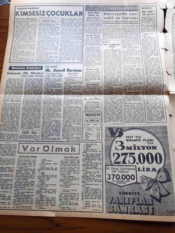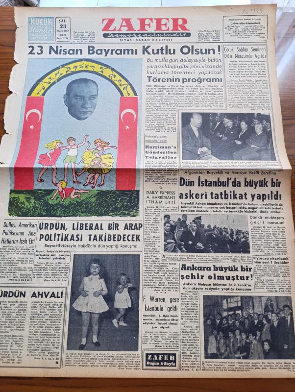 Zafer Gazetesi - 23 Nisan 1957 - 23 Nisan Bayramı Kutlu Olsun - Milli Hakimiyet Ve Çocuk Bayramı Töreninin Programı - Makarios'u Davet Ettiğinden Dolayı New York Valisi Harriman'a Gönderilen Telgraflar - Afganistan Başvekili Ve Hariciye Vekili Şerefine Dün İstanbul'da Büyük Bir Askeribl Tatbikat Yapıldı - Ürdün Liberal Bir Arap Politikası Takip Edecek - Piyasaya Çıkarılacak Olan Yeni 1 Liralıklar - Aydın Efeler Balosu Bu Gece Verilecek - Ramazan Sohbetleri Yazan Ragıp Akyavaş - Perihan Parla - Var Olmak Yazan İlhan Tarus - Cezayirde Vuku Bulan Kanlı Çarpışmalar - Saatte 386 Km Süratle Hareket Edecek Otomobil - Arend Roland Kuyruklu Yıldızı Fransa'da Göründü - Washington'da 23 Nisan Bayramı - Atatürk Kız Enstitüsündeki Defileden Notlar - Garanti Bankası - Emlak Kredi Bankası - Sümerbank - Ankara Filarmoni Derneğinin Olağanüstü Konseri Solisti Leyla Gencer - Pe Re Ja Limon Kolonyası - Komili Sabun - Genç Milli Takım Antrenörü Cihat Arman - İran'ı Basketbolda Yendik adlı eser, Kitap > Süreli Yayınlar > Gazeteler > Türkiye > Genel > Günlük kategorisinde İkinci El olarak satıştadır.