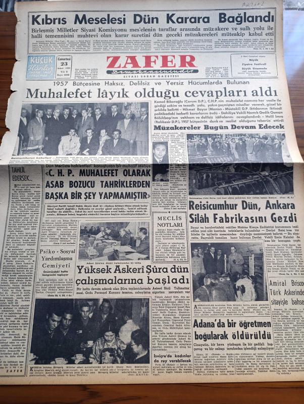 Zafer Gazetesi - 23 Şubat 1957 - Kıbrıs Meselesi Dün Karara Bağlandı - 1957 Bütçesine Haksız Delilsiz Ve Yersiz Hücumlarda Bulunan Muhalefet Layık Olduğu Cevapları Aldı - CHP Muhalefet Olarak Asab Bozucu Tahriklerden Başka Bir Şey Yapmamıştır - Kemal Biberoğlu - Psiko Sosyal Yardımlaşma Cemiyeti - Reisicumhur Dün Ankara Silah Fabrikasını Gezdi - Yüksek Askeri Şura Dün Çalışmalarına Başladı - Adana'da Bir Öğretmen Boğularak Öldürüldü - İsviçre'de Kadınlar Da Rey Verebilecek - Güzel Sanatlar Birliği Resim Sergisi Açıldı - Mimarların Balosu Bu Akşam Verilecek - Kıbrıs Meselesi Birleşmiş Milletlerde Selim Sarper'in Verdiği Beyanat - Film Yıldızı Gene Kelly - Montesi Davası Devam Ediyor - İtalyan Ordu Takımı 34 Kişilik Kafile Halinde İzmir'de - Fenerbahçe Güneşspor Maçı - Gençlerbirliği Otoyıldırım Maçı - Türkiye Boks Birinciliklerine Bugün Harp Okulu Salonunda Başlıyor - Sümerbank - Fay Temizleme Tozu - Belalı Kaptan Filmi Başrolde Henry Fonda James Cagney Ankara Sinemasında - Mason Balosu, Zeki Rıza Sporel tarafından kaleme alınmıştır. Zafer Gazetesi - 23 Şubat 1957 - Kıbrıs Meselesi Dün Karara Bağlandı - 1957 Bütçesine Haksız Delilsiz Ve Yersiz Hücumlarda Bulunan Muhalefet Layık Olduğu Cevapları Aldı - CHP Muhalefet Olarak Asab Bozucu Tahriklerden Başka Bir Şey Yapmamıştır - Kemal Biberoğlu - Psiko Sosyal Yardımlaşma Cemiyeti - Reisicumhur Dün Ankara Silah Fabrikasını Gezdi - Yüksek Askeri Şura Dün Çalışmalarına Başladı - Adana'da Bir Öğretmen Boğularak Öldürüldü - İsviçre'de Kadınlar Da Rey Verebilecek - Güzel Sanatlar Birliği Resim Sergisi Açıldı - Mimarların Balosu Bu Akşam Verilecek - Kıbrıs Meselesi Birleşmiş Milletlerde Selim Sarper'in Verdiği Beyanat - Film Yıldızı Gene Kelly - Montesi Davası Devam Ediyor - İtalyan Ordu Takımı 34 Kişilik Kafile Halinde İzmir'de - Fenerbahçe Güneşspor Maçı - Gençlerbirliği Otoyıldırım Maçı - Türkiye Boks Birinciliklerine Bugün Harp Okulu Salonunda Başlıyor - Sümerbank - Fay Temizleme Tozu - Belalı Kaptan Filmi Başrolde Henry Fonda James Cagney Ankara Sinemasında - Mason Balosu adlı eser Türkçe dilindedir.