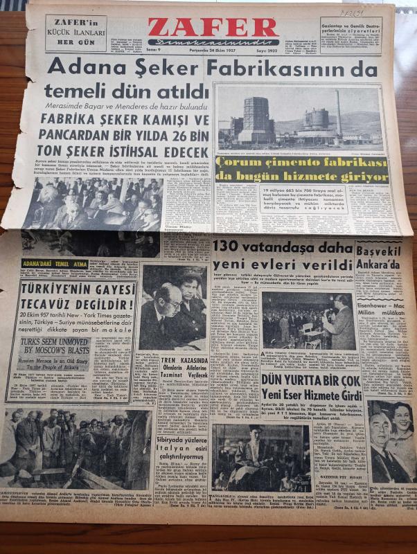 Zafer Gazetesi - 24 Ekim 1957 - Adana Şeker Fabrikasının Da Temeli Dün Atıldı - Fabrika Şeker Kamışı Ve Pancardan Bir Yılda 26 Bin Ton Şeker İstihsal Edecek - New York Times Gazetesi Türkiye'nin Suriye Sınırında Gayesi Tecavüz Değildir - Çorum Çimento Fabrikası Da Bugün Hizmete Giriyor - 130 Vatandaşa Daha Yeni Evleri Verildi - Başvekil Adnan Menderes Ankara'da - İsmailiye Mezhebinin Yeni Reisi Ağa Han - Eski Şöhretlerden Paulette Goddard Evlendi - Eisenhower Mac Millan Mülakatı - Gima Maltepe Mağazası - Katherin Yazan Hans Habe Yazı Dizisi - Florida'dan Hareket Eden Jüpiter Hedefini Buldu - New York'ta Hasılat Kıran Üç Film Mussolinin Metresleri Peron'un Kızları Ve Faruk'un Zevceleri - İdil Biret'in piyano Resitali - Opon Ağrı Kesici - Beynelmilel Boks Turnuvası Bu Gece Saat 21 de Spor Sarayında Başlıyor - Gençlik Parkı Havuz Başında Buz Revüsü - Adalet Beykoz Maçı - Seyfi Cenap Berksoy İstifa Haberlerine Şaştı - Sabena Belçika Hava Yolları - Milli Voleybol Antrenörü Jiri Kobrle adlı eser, Kitap > Süreli Yayınlar > Gazeteler > Türkiye > Genel > Günlük kategorisinde İkinci El olarak satıştadır.
