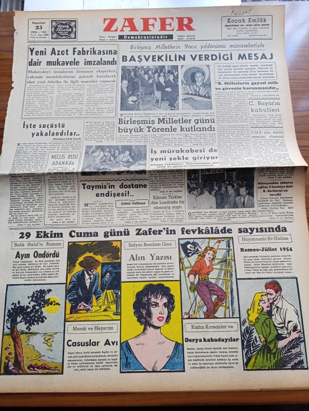 Zafer Gazetesi - 25 Ekim 1954 - Yeni Azot Fabrikasına Dair Mukavele İmzalandı - Birleşmiş Milletlerin 9. Yıldönümü Münasebetiyle Başvekil Adnan Menderes'in Verdiği Mesaj - Celal Bayar'ın Kabulleri - 29 Ekim Cuma Günü Zafer Gazetesi'nin Fevkalade Sayısında Refik Halid Karay'ın Romanı Ayın Ondördü - Kadın Korsanlar Ve Derya Kabadayıları - Casuslar Avı - İtalyan Bombası Gina - Orhan Seyfi Orhon Köşe Yazısı - 30. Ölüm Yıldönümünde Ziya Gökalp Yazan Enver Behnan Şapolyo Yazı Dizisi - Turizm Bankası Yakında Kuruluyor - Dünkü At Yarışları - Sahte İsa Gaston Dobray Ve Karısının Mahkemelimerine Başlandı - Cumhuriyet Kupası Maçları - Fenerbahçe Emniyet İle Berabere Kaldı - İkiz Dünya Başka Alemlerde Bir Macera Çizgi Roman - Girgin Vik'in Harikulade Maceraları Haydutlar Peşinde Çizgi Roman - Yeni Filmler Kanlı İhtilâl Gece Canavarı Ölüm İşareti - Mona Lisa Model Terzihanesi - Ankara'nın En Büyük Mobilya Mağazası Bursa Mobilya Pazarı - Kayaş Pastörize Süt Fabrikası - Atatürk Orman Çiftliği adlı eser, Kitap > Süreli Yayınlar > Gazeteler > Türkiye > Genel > Günlük kategorisinde İkinci El olarak satıştadır.