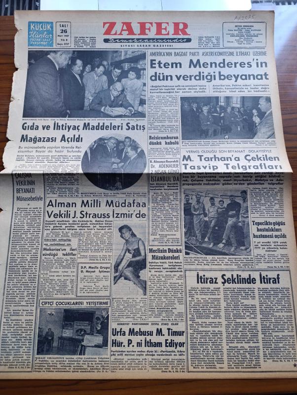 Zafer Gazetesi - 26 Mart 1957 - Gıda Ve İhtiyaç Maddeleri Satış Mağazası Açıldı Reisicumhur Celal Bayar Törende Hazır Bulundu - Alman Milli Müdafaa Vekili J. Strauss İzmir'de - İspanyol Şarkıcısı Ve Sinema Yıldızı Paquita Rico - Kıbrıs'taki Tedhişçiliğine Son Verilebilmesi İçin Makarios'un İleri Sürdüğü Teklifler - İzmir Tepecik'te Göğüs Hastalıkları Hastanesi Açıldı - Batı Almanya Başvekili Adenauer 2 Nisan Günü İstanbul'da - Mümtaz Tarhan - Amerika'nın Bağdat Paktı Askerî Komitesine İltihakı Üzerine Ethem Menderes'in Dün Verdiği Beyanat - Var Olmak Yazan İlhan Tarus Yazı Dizisi - Sabri Alınak - Türkocağının 46. Kuruluş Yıldönümü - Japonya'nın Leslie Caron'u Ne Alemde - Hatay'da Nuh'un Gemisini Canlandıran Mozaik Bulundu - Gima'nın Bakkal Dükkanında Pazarlık Yok Müşteri Kendi İşini Görecek - Tos Yiyen Hakem Sulhi Garan - Cenubi Amerika'da Boğalar Gibi Muhafazadaki Seyirci - Vehbi Emre Güreşte Yeni Kaideleri Açıldı - Havilland Krem - Komili Sabun adlı eser, Kitap > Süreli Yayınlar > Gazeteler > Türkiye > Genel > Günlük kategorisinde İkinci El olarak satıştadır.