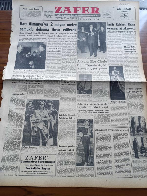 Zafer Gazetesi - 27 Ekim 1959 - Batı Almanya'ya 2 Milyon Metre Pamuklu Dokuma İhraç Edilecek - Kanadalı Gazeteci Arthur Blakely Türkiye Orta Doğu'da Bekçidir - İran Şahı Muhammed Rıza Pehlevi'nin Doğum Günü - Cumhuriyet Bayramı'nda Bulunacak Yabancı Heyetlerdre Ankara'ya Geliyor - Ankara Ebe Okulunu Muavenet Vekili Doktor Lütfi Kırdar Hizmete Açıyor Fotoğrafı - Hınıs'daki Depremin Bilançosu - Kral Oidipus Tragedyası İstanbul'da - Mahzun Prenses Margaret - Elektrik Kömürü İmal Eden Fabrika Tevsi Olunacak - Büyük Kumar Yazan Thomas Costain Yazı Dizisi - Profesör Doktor Bahtiyar Demirağ - Türk Kadınlar Birliği 29 Ekim'de Konser Verdirecek - İrticai Beyanname Dağıtanlar Aranıyor - Emniyet Müdürlüğüne Ahmet Paftalı Tayin Oldu - Kruşçef Romanya'yı Neden Ziyaret Etmiş - Kibar Aileler Yazan M. Druon Yazı Dizisi - Batı Almanya Başvekili Adenauer Paris'i Ziyaret Edecek - Doktor Severo Ochoa Nobel'i Kutluyor - Kuzey Kore'de Çinlilerle Sovyetlerin Mücadelesi - Sana Nebati Margarin - Edison Ampul, Kâmil Gündeş tarafından kaleme alınmıştır. Zafer Gazetesi - 27 Ekim 1959 - Batı Almanya'ya 2 Milyon Metre Pamuklu Dokuma İhraç Edilecek - Kanadalı Gazeteci Arthur Blakely Türkiye Orta Doğu'da Bekçidir - İran Şahı Muhammed Rıza Pehlevi'nin Doğum Günü - Cumhuriyet Bayramı'nda Bulunacak Yabancı Heyetlerdre Ankara'ya Geliyor - Ankara Ebe Okulunu Muavenet Vekili Doktor Lütfi Kırdar Hizmete Açıyor Fotoğrafı - Hınıs'daki Depremin Bilançosu - Kral Oidipus Tragedyası İstanbul'da - Mahzun Prenses Margaret - Elektrik Kömürü İmal Eden Fabrika Tevsi Olunacak - Büyük Kumar Yazan Thomas Costain Yazı Dizisi - Profesör Doktor Bahtiyar Demirağ - Türk Kadınlar Birliği 29 Ekim'de Konser Verdirecek - İrticai Beyanname Dağıtanlar Aranıyor - Emniyet Müdürlüğüne Ahmet Paftalı Tayin Oldu - Kruşçef Romanya'yı Neden Ziyaret Etmiş - Kibar Aileler Yazan M. Druon Yazı Dizisi - Batı Almanya Başvekili Adenauer Paris'i Ziyaret Edecek - Doktor Severo Ochoa Nobel'i Kutluyor - Kuzey Kore'de Çinlilerle Sovyetlerin Mücadelesi - Sana Nebati Margarin - Edison Ampul adlı eser Türkçe dilindedir.