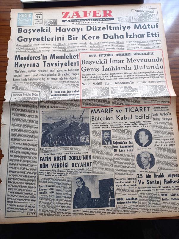 Zafer Gazetesi - 27 Şubat 1957 - Başvekil Adnan Menderes Havayı Düzeltmeye Matuf Gayretlerini Bir Kere Daha İzhar Etti - Adnan Menderes'in Memleket Hayrına Tavsiyeleri - Siyasi Komisyonun Kıbrıs Kararından Sonra Fatin Rüştü Zorlu'nun Verdiği Beyanat - Başvekil Adnan Menderes İmar Mevzuunda Geniş İzahlarda Bulundu - Nafia Vekili Ethem Menderes'in Etraflı Konuşması - Maarif Ve Ticaret Bütçeleri Kabul Edildi - Suvat Vapuru Dün Bir Yolcu Gemisine Hafifçe Çarptı - 25 Bin Liralık Rüşvet ve Şantaj Hadisesi - Ürdün Amerikan Yardımını Kabul Ediyor - Hasan Polatkan'ın 1957 Mali Yıl Bütçesine Dair Konuşması - Andaluz Santiago Bale Revüsü - Yeni Turist Polisi Şubesi İstanbul'da Faaliyete Geçti - Opera Van Gogh Yazan Orhan Remzi Yüreğir - Orhan Seyfi Orhon Köşe Yazısı - Kıbrıs Meselesi Birleşmiş Milletlerde Selim Sarper'in Verdiği Beyanat - Milli Takım Namzetleri 6 Kasımpaşa 1 - Eskişehir'de Modern Bir Stad - Ankara Makarnası - Dünya Demiryolları Güreş Şampiyonası - Güreş Takımımızın Kadrosu, Zeki Rıza Sporel tarafından kaleme alınmıştır. Zafer Gazetesi - 27 Şubat 1957 - Başvekil Adnan Menderes Havayı Düzeltmeye Matuf Gayretlerini Bir Kere Daha İzhar Etti - Adnan Menderes'in Memleket Hayrına Tavsiyeleri - Siyasi Komisyonun Kıbrıs Kararından Sonra Fatin Rüştü Zorlu'nun Verdiği Beyanat - Başvekil Adnan Menderes İmar Mevzuunda Geniş İzahlarda Bulundu - Nafia Vekili Ethem Menderes'in Etraflı Konuşması - Maarif Ve Ticaret Bütçeleri Kabul Edildi - Suvat Vapuru Dün Bir Yolcu Gemisine Hafifçe Çarptı - 25 Bin Liralık Rüşvet ve Şantaj Hadisesi - Ürdün Amerikan Yardımını Kabul Ediyor - Hasan Polatkan'ın 1957 Mali Yıl Bütçesine Dair Konuşması - Andaluz Santiago Bale Revüsü - Yeni Turist Polisi Şubesi İstanbul'da Faaliyete Geçti - Opera Van Gogh Yazan Orhan Remzi Yüreğir - Orhan Seyfi Orhon Köşe Yazısı - Kıbrıs Meselesi Birleşmiş Milletlerde Selim Sarper'in Verdiği Beyanat - Milli Takım Namzetleri 6 Kasımpaşa 1 - Eskişehir'de Modern Bir Stad - Ankara Makarnası - Dünya Demiryolları Güreş Şampiyonası - Güreş Takımımızın Kadrosu adlı eser Türkçe dilindedir.