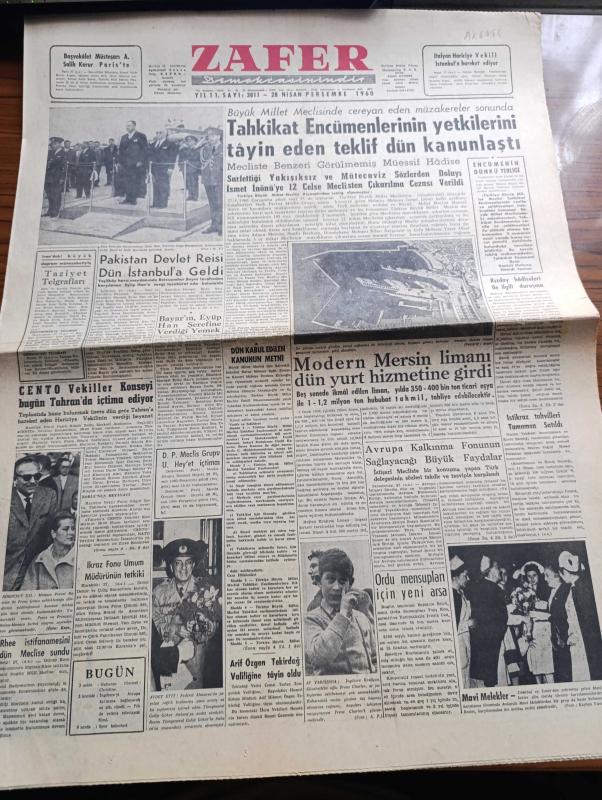 Zafer Gazetesi - 28 Nisan 1960 - Pakistan Devlet Reisi Dün İstanbul'a Geldi - Tahkikat Encümenlerinin Yetkilerini Tayin Eden Teklif Dün Kanunlaştı - Modern Mersin Limanı Dün Yurt Hizmetine Girdi - Celal Bayar'ın Eyüp Han Şerefine Verdiği Yemek - Avrupa Kalkınma Fonunun Sağlayacağı Büyük Faydalar - Haftanın Filmleri Christine Yazan Fadıl Taylan - Karanlıktaki Kadın Yazan Frank Slangher Yazı Dizisi - Ayşegül Sarıca Konser Verecek - Ulus Gazetesi Bir Ay Kapatılacak - Azerbaycan'ın 40. İstila Yılı Anıldı - Anthony Eden'in Siyasi Hatıraları Yazı Dizisi - Tek Kurşunla Vurulanlar Yazı Dizisi - Beşiktaş Feriköy'ü Zorlukla Yendi - 125 Kilometrelik Hatay Turu Bisiklet Yarışı Bugün Yapılıyor - Bugünkü At Yarışları adlı eser, Kitap > Süreli Yayınlar > Gazeteler > Türkiye > Genel > Günlük kategorisinde İkinci El olarak satıştadır.