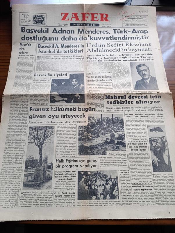 Zafer Gazetesi - 30 Aralık 1954 - Mısır'da Zirai Reform Yazan Mümtaz Faik Fenik Köşe Yazısı - Başvekil Adnan Menderes Türk Arap Dostluğunu Daha Da Kuvvetlendirmiştir - Başvekil Adnan Menderes'in İstanbul'da Tetkikleri - Ürdün Sefiri Ekselans Abdülmecid'in Beyanatı - Mahsul Devresi İçin Tedbirler Alınıyor - Fransız Hükümeti Bugün Güven Oyu İsteyecek - Troçki'nin Katili Jacques Mornand Yakında Serbest Bırakılacaktır - Ayın Ondördü Yazan Refik Halid Karay Yazı Dizisi - Kanserin İlacı Yazan Orhan Seyfi Orhon Köşe Yazısı - Silvana Panpanini Çevirmiş Olduğu Filmlerin Birinde Cüretkar Bir Sahne Fotoğraf - Şerefli İhanet Yazanlar F. Owen H. Franke - Efsanevi Bir Servetin Sahibi S. Onasis - Beşiktaş Ankara'ya Geliyor - Kayak Hakem Öğrenen Kursu Haftaya Açılıyor - Basketbol Teşvik Turnuvası Notları - Ankara İstanbul İzmir Radyosu Programı - Nigar Uluerer Gümüş Palas Aile Salonunda, Mümtaz Faik Fenik tarafından kaleme alınmıştır. Zafer Gazetesi - 30 Aralık 1954 - Mısır'da Zirai Reform Yazan Mümtaz Faik Fenik Köşe Yazısı - Başvekil Adnan Menderes Türk Arap Dostluğunu Daha Da Kuvvetlendirmiştir - Başvekil Adnan Menderes'in İstanbul'da Tetkikleri - Ürdün Sefiri Ekselans Abdülmecid'in Beyanatı - Mahsul Devresi İçin Tedbirler Alınıyor - Fransız Hükümeti Bugün Güven Oyu İsteyecek - Troçki'nin Katili Jacques Mornand Yakında Serbest Bırakılacaktır - Ayın Ondördü Yazan Refik Halid Karay Yazı Dizisi - Kanserin İlacı Yazan Orhan Seyfi Orhon Köşe Yazısı - Silvana Panpanini Çevirmiş Olduğu Filmlerin Birinde Cüretkar Bir Sahne Fotoğraf - Şerefli İhanet Yazanlar F. Owen H. Franke - Efsanevi Bir Servetin Sahibi S. Onasis - Beşiktaş Ankara'ya Geliyor - Kayak Hakem Öğrenen Kursu Haftaya Açılıyor - Basketbol Teşvik Turnuvası Notları - Ankara İstanbul İzmir Radyosu Programı - Nigar Uluerer Gümüş Palas Aile Salonunda adlı eser Türkçe dilindedir.