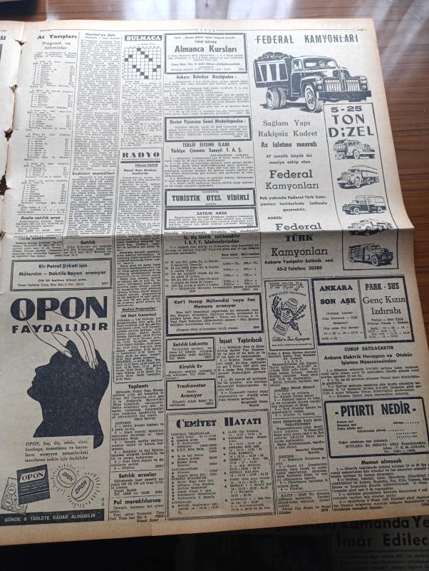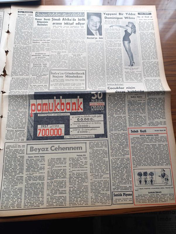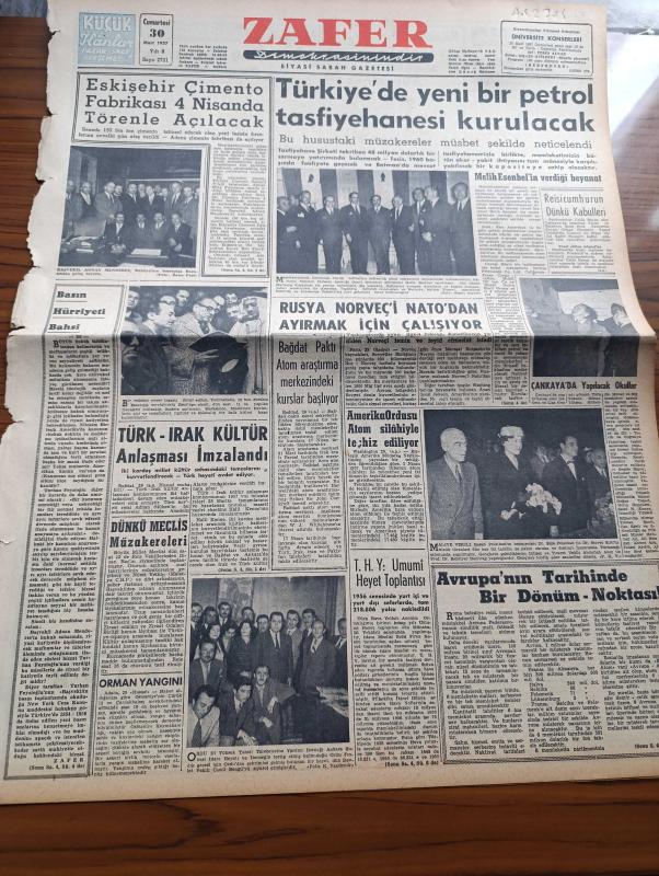 Zafer Gazetesi - 30 Mart 1957 - Eskişehir Çimento Fabrikası 4 Nisan'da Törenle Açılacak - Türkiye'de Yeni Bir Petrol Tasfiyehanesi Kurulacak - Türk Irak Kültür Anlaşması İmzalandı - Rusya Norveç'i Nato'dan Ayırmak İçin Çalışıyor - Amerikan Ordusu Atom Silahıyla Teçhiz Ediliyor - Melih Esenbel'in Verdiği Beyanat - Reisicumhur Celal Bayar'ın Dünkü Kabulleri - Türk Hava Yolları Umumi Heyet Toplantısı - Bağdat Paktı Atom Araştırma Merkezindeki Kurslar Başlıyor - İngiltere'den Alınacak Uçakların Üstünlüğü - Riyaseticumhur Filarmoni Orkestrası 51. Üniversite Konserini Bugün Verecek - Var Olmak Yazan İlhan Tarus Yazı Dizisi - Yepyeni Bir Yıldız Dominigue Wilms- Çocuklar Niçin Derse Kaldırılır - Beyaz Cehennem Yazan Clintan Secley - Federal Kamyonları - Bulmaca - Radyo - Opon Ağrı Kesici - Rugby Ve Fransa - Galatasaray İle Vefa Bu Yıl 3 Defa Karşı Karşıya - Misafir İstanbulspor Yolspor'la Ankaragücü Demirspor Oynuyor - Nefis Tamek Kompostoları - Ali Gencay'ın Ardından - Sümerspor adlı eser, Kitap > Süreli Yayınlar > Gazeteler > Türkiye > Genel > Günlük kategorisinde İkinci El olarak satıştadır.