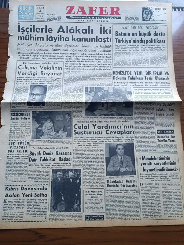 Zafer Gazetesi - 5 Şubat 1957 - İşçilerle Alâkalı İki Mühim Layiha Kanunlaştı - Çalışma Vekili Mümtaz Tarhan'ın Verdiği Beyanat - Hayati Orta Doğu Bölgesinde Batı'nın En Büyük Dostu Türkiye'nin Dış Politikası - Denizli'de Yeni Bir İplik ve Dokuma Fabrikası Tesis Olunacak - Dikişli Boru Fabrikası Seri İmalata Başladı - Hakikatleri Tahrif Eden CHP'li Mebusa Celal Yardımcı'nın Susturucu Cevapları - İzmir'deki Büyük Deniz Kazasına Dair Tahkikat Başladı - Reisicumhur Celal - Kıbrıs Davasında Açılan Yeni Sayfa - Türk Hava Yollarında Dün İki Yeni Kurs Açıldı - Milli Mücadelenin İç Alemi Ve Ankara Yazan Enver Behnan Şapolyo Yazı Dizisi - Özlediğim Kadın Yazan Mükerrem Kâmil Su Yazı Dizisi - Çekoslovakya'da 12 Bin Siyasi Mahkum Uranyum Madenlerinde Çalışıyor - Rita Hayworth'un Filmi De Trinidad Adasında Geçiyor - İzmir'in Elektrik Sıkıntısı Gideriliyor - Kıbrıslı Türklerin Protesto Hareketleri - Yeni Güreş Federasyonu Başkanı Seyfi Cenap Berksoy - Turgay Şeren - Federasyon Kupası Voleybol Maçı, Zeki Rıza Sporel tarafından kaleme alınmıştır. Zafer Gazetesi - 5 Şubat 1957 - İşçilerle Alâkalı İki Mühim Layiha Kanunlaştı - Çalışma Vekili Mümtaz Tarhan'ın Verdiği Beyanat - Hayati Orta Doğu Bölgesinde Batı'nın En Büyük Dostu Türkiye'nin Dış Politikası - Denizli'de Yeni Bir İplik ve Dokuma Fabrikası Tesis Olunacak - Dikişli Boru Fabrikası Seri İmalata Başladı - Hakikatleri Tahrif Eden CHP'li Mebusa Celal Yardımcı'nın Susturucu Cevapları - İzmir'deki Büyük Deniz Kazasına Dair Tahkikat Başladı - Reisicumhur Celal - Kıbrıs Davasında Açılan Yeni Sayfa - Türk Hava Yollarında Dün İki Yeni Kurs Açıldı - Milli Mücadelenin İç Alemi Ve Ankara Yazan Enver Behnan Şapolyo Yazı Dizisi - Özlediğim Kadın Yazan Mükerrem Kâmil Su Yazı Dizisi - Çekoslovakya'da 12 Bin Siyasi Mahkum Uranyum Madenlerinde Çalışıyor - Rita Hayworth'un Filmi De Trinidad Adasında Geçiyor - İzmir'in Elektrik Sıkıntısı Gideriliyor - Kıbrıslı Türklerin Protesto Hareketleri - Yeni Güreş Federasyonu Başkanı Seyfi Cenap Berksoy - Turgay Şeren - Federasyon Kupası Voleybol Maçı adlı eser Türkçe dilindedir.