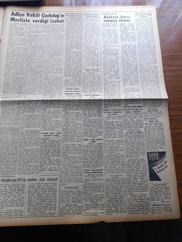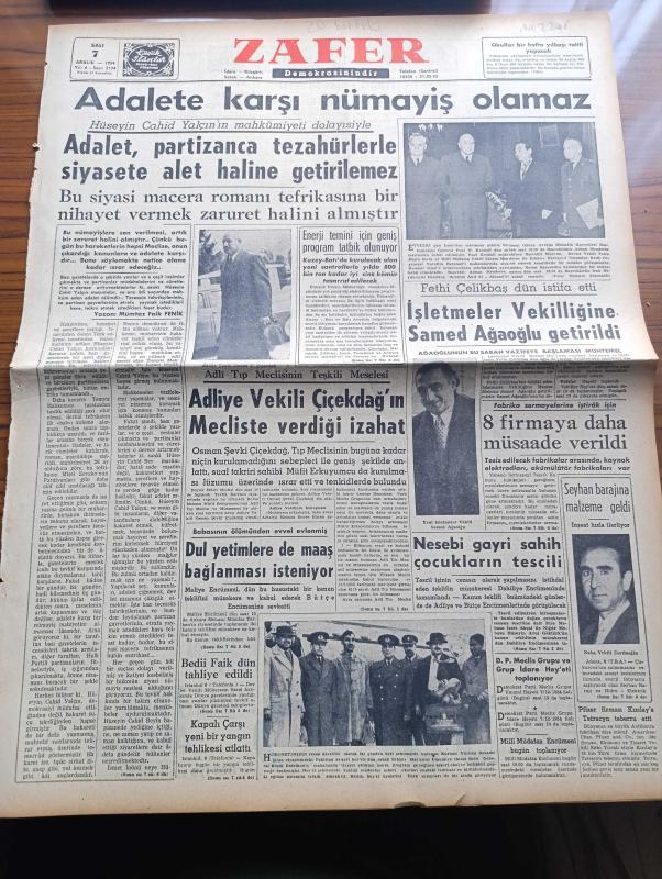 Zafer Gazetesi - 7 Aralık 1954 - Mümtaz Faik Fenik Köşe Yazısı - Adalete Karşı Nümayiş Olamaz - Hüseyin Cahit Yalçın'ın Mahkumiyeti - Fethi Çelikbaş Dün İstifa Etti İşletmeler Vekilliğine Samed Ağaoğlu Getirildi - Adliye Vekili Osman Şevki Çiçekdağ'ın Mecliste Verdiği İzahat - Dul Yetimlere De Maaş Bağlanması İsteniyor - Bedii Faik Dün Tahliye Edildi - Seyhan Barajına Malzeme Geldi İnşaat Hızlı İlerliyor - Kapalı Çarşı Yeni Bir Yangın Tehlikesi Atlattı - Pzifer İlaç Firması Kızılay'a Tetracyn Teberru Etti - Yahya Kemal Yazan Orhan Seyfi Orhon Köşe Yazısı - Ayın Ondördü Yazan Refik Halid Karay Yazı Dizisi - Atatürk'ün Ankara'ya İlk gelişi - Kral Emmanuel'in Serveti Paylaştırıldı - Kızılların Öldürdüğü Türk Spikeri Abdurrahman Fat Ali Bey - Hür Avrupa Radyosu Ruslara Hücum Ediyor - Yeni Bir Cinsiyet İlahesi Kim Novak - İskambil Kağıdı Ne Zaman İcad Edildi - Romeo Ve Jüliet 1954 Yazan Reinhard Fedumann Yazı Dizisi - Atletizm Federasyonu Balkan Oyunları İçin 8 Komite Kurdu - Edison Ampul adlı eser, Kitap > Süreli Yayınlar > Gazeteler > Türkiye > Genel > Günlük kategorisinde İkinci El olarak satıştadır.