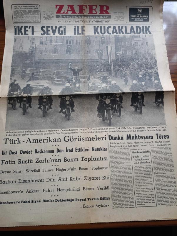 Zafer Gazetesi - 7 Aralık 1959 - Amerikan Başkanı Eisenhower'i Sevgi İle Kucakladık - Türk Amerikan Görüşmeleri - Ankara'da Amerikan Başkanı Eisenhower İçin Muhteşem Tören - Fatin Rüştü Zorlu'nun Basın Toplantısı - Beyaz Saray Sözcüsü James Hagerty'nin Basın Toplantısı - Başkan Eisenhower Dün Anıtkabir'i Ziyaret Etti - Eisenhower'e Ankara Fahri Hemşehriliği Beratı Verildi - Eisenhower'e Fahri Siyasi İlimler Doktorluğu Payesi Tevcih Edildi - Basın Yayın Ve Turizm Umum Müdürü Altemur Kılıç'ın Resepsiyonu - Türk Filarmoni Derneği - İhtiras Tramvayının Provalarına Başlandı - Devlet Tiyatrosu Umum Müdürü Cüneyt Gökçer - Fransa Yakında İlk Atom Tecrübesi Yapacak - Başkan Eisenhower'in Ankara Ziyaretinden Fotoğraflar - Eisenhower'in Gelini Dün Hacettepe Çocuk Hastanesini Gezdi - Amatör Milli Takımlar Maçında Irak'ı 7 1 Yendik - Demirspor Altay'ı 3 1 Yendi - Paris'te Sevişelim Filmi İnci Sinemasında - Movado Saatleri - Bağrı Yanık Türk Filmi Park ve Sus Sinemalarında adlı eser, Kitap > Süreli Yayınlar > Gazeteler > Türkiye > Genel > Günlük kategorisinde İkinci El olarak satıştadır.