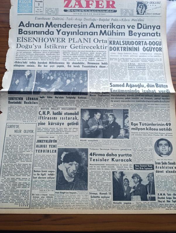 Zafer Gazetesi - 7 Şubat 1957 - Eisenhower Doktrini - Türk Arap Dostluğu - Bağdat Paktı - Kıbrıs Meselesi - Adnan Menderes'in Amerikan Ve Dünya Basınında Yayınlanan Mühim Beyanatı - Eisenhower Planı Orta Doğu'ya İstikrar Getirecektir - Kral Suud Orta Doğu Doktrinini Övüyor - Samed Ağaoğlu Dün Bütçe Encümeninde İzahat Verdi - İran Şahı Rıza Pehlevi İran Şahı Suudi Arabistan'a Davet Olundu - CHP Hatibi Nuri Sertoğlu Otomobil İftirasını Isıtarak Yine Kürsüye Getirdi - Jokey Kulübü'nün Aldığı Yeni Tedbirler - Van Gogh'un Hayatı - Süveyş Kanalı 15 Şubat'ta Açılıyor - Milli Mücadelenin İç Alemi Ve Ankara Yazan Enver Behnan Şapolyo Yazı Dizisi - Özlediğim Kadın Yazan Mükerrem Kâmil Su Yazı Dizisi - Suni Radyoaktif İzotoplar Ve Önemleri - Kızılay Kan Bankası Yetiştirme Yurdundan 35 Hanım Mezun Oldu - Viyana Tiyatrosu - Konya Ovasında Yeniden İki Baraj Yapılıyor - Etna Yanardağı Yeniden Faaliyete Başladı - Boks Tarihi Ve Bugünkü Modern Tekniğin Esasları - Turgay Şeren Ordu Takımında Yok adlı eser, Kitap > Süreli Yayınlar > Gazeteler > Türkiye > Genel > Günlük kategorisinde İkinci El olarak satıştadır.