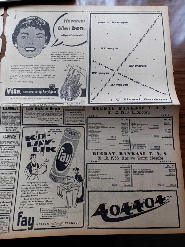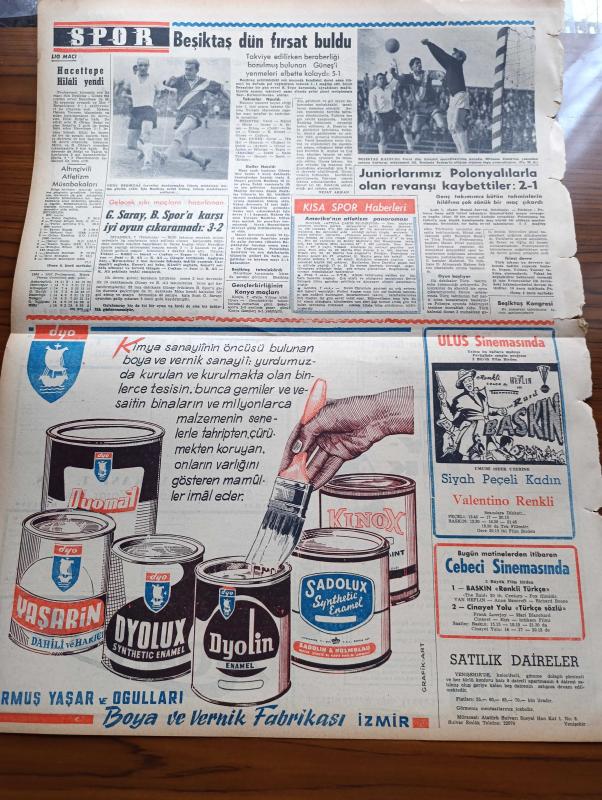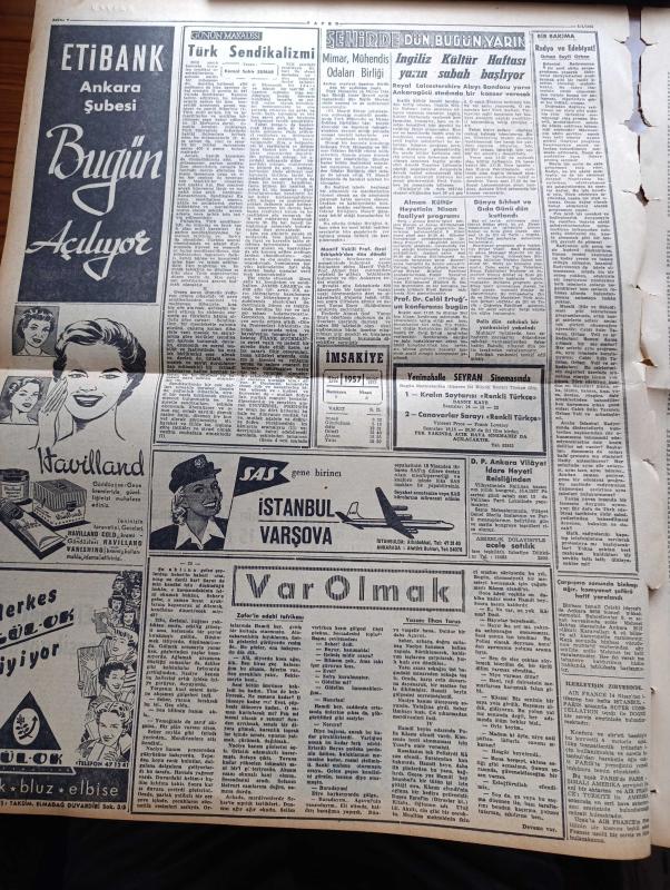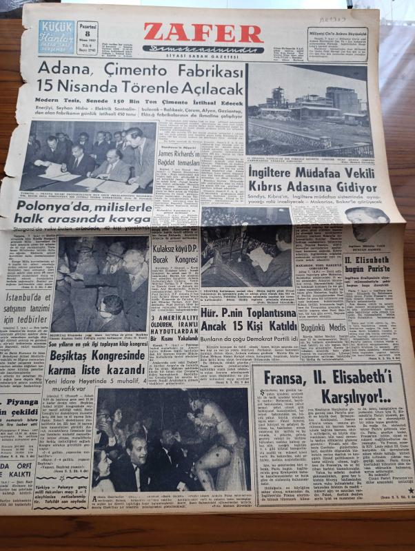 Zafer Gazetesi - 8 Nisan 1957 - Adana Çimento Fabrikası 15 Nisan'da Törenle Açılacak - Polonya'da Milislerle Halk Arasında Kavga - İngiltere Müdafaa Vekili Kıbrıs Adasına Gidiyor - Beşiktaş Kongresinde Karma Liste Kazandı - Kraliçe İkinci Elizabeth Bugün Paris'te - Türk Sendikalizmi - İngiliz Kültür Haftası Yarın Sabah Başlıyor - Var Olmak Yazan İlhan Tarus Yazı Dizisi - Dünya Sıhhat Ve Gıda Günü Dün Kutlandı - Üçüncü Dünya Harbi İhtimali - Raybank - Etibank Ankara Şubesi Bugün Açılıyor - Gül Ok Etek Bluz Elbise - Mimar Mühendis Odaları Birliği - Pe Re Ja Limon Kolonyası - Vita Yağ - Fay Temizleme Tozu - Milli Piyango Dün Çekildi - Altınçivili Atletizm Müsabakaları - Hacettepe Hilali Yendi - Galatasaray Beyoğluspor'a Karşı İyi Oyun Çıkaramadı - Durmuş Yaşar Ve Oğulları DYO Boya - Ulus Sineması adlı eser, Kitap > Süreli Yayınlar > Gazeteler > Türkiye > Genel > Günlük kategorisinde İkinci El olarak satıştadır.