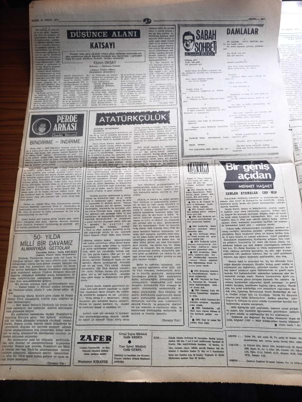 Zafer Gazetesi - Turkish Newspaper - 13 Nisan 1974 - İstanbul gazetesinde çıkan asılsız haberle ile ilgili olarak açıklamada bulunan Ankara baro Başkanı Yekta Güngör Özden Fotoğrafı - CHP Milli Selamet Partisi koalisyonu zam için kuruldu diyen Adalet Partili Selahattin Kılıç - Ecevit hükümetine güvensizlik yaygın hal alıyor - bir dergiye göre CHP Ticaret odalarını ele geçirmek için tamim yapmış - Konya'dan 65 bin imzalı ve 316 metrelik dilekçe geldi Kızıl bayrak asanları askere kurşun sıkanları affetmeyin Fotoğrafı - kanun çıkarsa Demokrat Parti ismi kullanılacak - İhtar mitingi bugün beyazıt'ta Fotoğrafı - Kore'de savaşanlara göre Barış'ın en kestirme yolu savaştan geçer - dünya barolar Birliği 1980 Kongresi Türkiye'de toplanacak - genelkurmay Başkanı Orgeneral Semih Sancar yurda döndü - televizyonda bugün - önce spor ahlakı idareci gözü ile Temel Budak - Bolulu futbolcu Sinan Beşiktaş forması giyeceğim dedi Fotoğrafı - Galatasaray Adana Demirspor maçı - Gençlerbirliği Sivas Maçı adlı eser, Kitap > Süreli Yayınlar > Gazeteler > Türkiye > Genel > Günlük kategorisinde İkinci El olarak satıştadır.