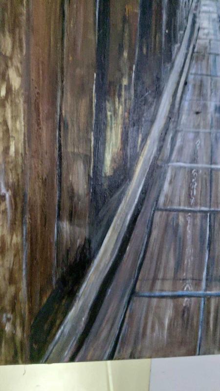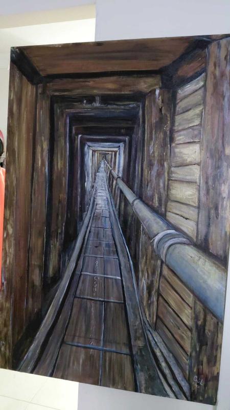 80x120 cm ölçülerindeki bu etkileyici eser, izleyicisini ahşap bir tünelin içine davet eden güçlü bir perspektif kurgusuna sahiptir. Derinliğe doğru uzanan yürüyüş yolu; zaman, sabır ve insanın kendi iç yolculuğunu simgeler. Ahşap dokuların ustalıkla işlendiği kompozisyon, ışık–gölge dengesiyle mekân algısını kuvvetlendirirken, eserin dramatik atmosferini ön plana çıkarır. Mekânın sessizliği ve tekrar eden mimari formlar, tabloya neredeyse meditatif bir etki kazandırır. Koleksiyonluk nitelikte, mekâna karakter katan, uzun bakışlar isteyen özel bir çalışmadır. Modern ve klasik mekânlarla uyumu yüksek, güçlü bir duvar parçası arayanlar için kaçırılmayacak bir eser. 📐 Ölçü: 80x120 cm 🖌️ Teknik: Tuval üzerine karışık teknik 🕰️ Dönem: Vintage / antika karakterli çalışma