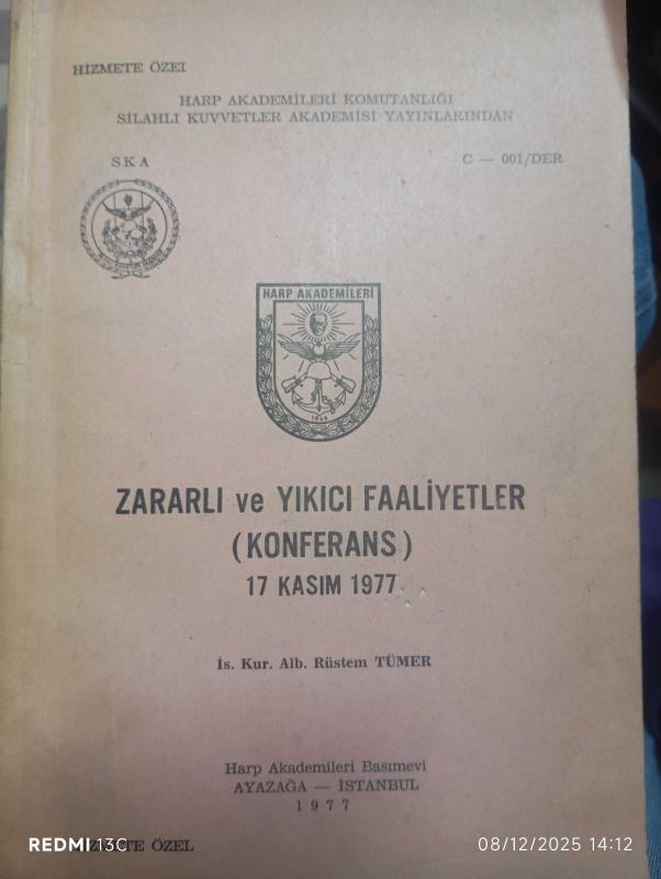 Zararlı ve Yıkıcı Faaliyetler (Konferans) 17 Kasım 1977, Rüstem Tümer tarafından kaleme alınmıştır. Kitap 1977 yılında Harp Akademileri Basımevi tarafından yayınlanmıştır. Zararlı ve Yıkıcı Faaliyetler (Konferans) 17 Kasım 1977 adlı eser Türkçe dilindedir.